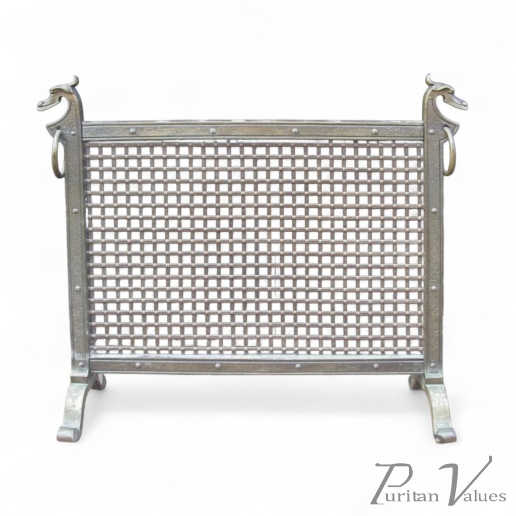 A good quality fire screen with dragon style heads and scroll feet. Even the mesh is made of brass with cold riveted construction.