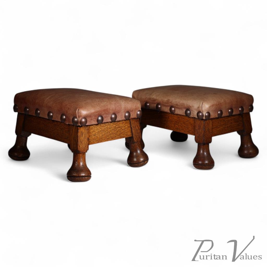 Pair of oak Thebes stools aligned to the Aesthetic Movement (1860–1900), c.1890, designed as low British footstools for a domestic interior. Each stool has a square framed seat upholstered in plain leather with a row of large dome studs defining the edge, raised on four short turned legs with mushroom feet. The aprons are of quarter-sawn oak, the ray fleck visually softening the geometric profile and giving the small forms a clear sense of material presence.