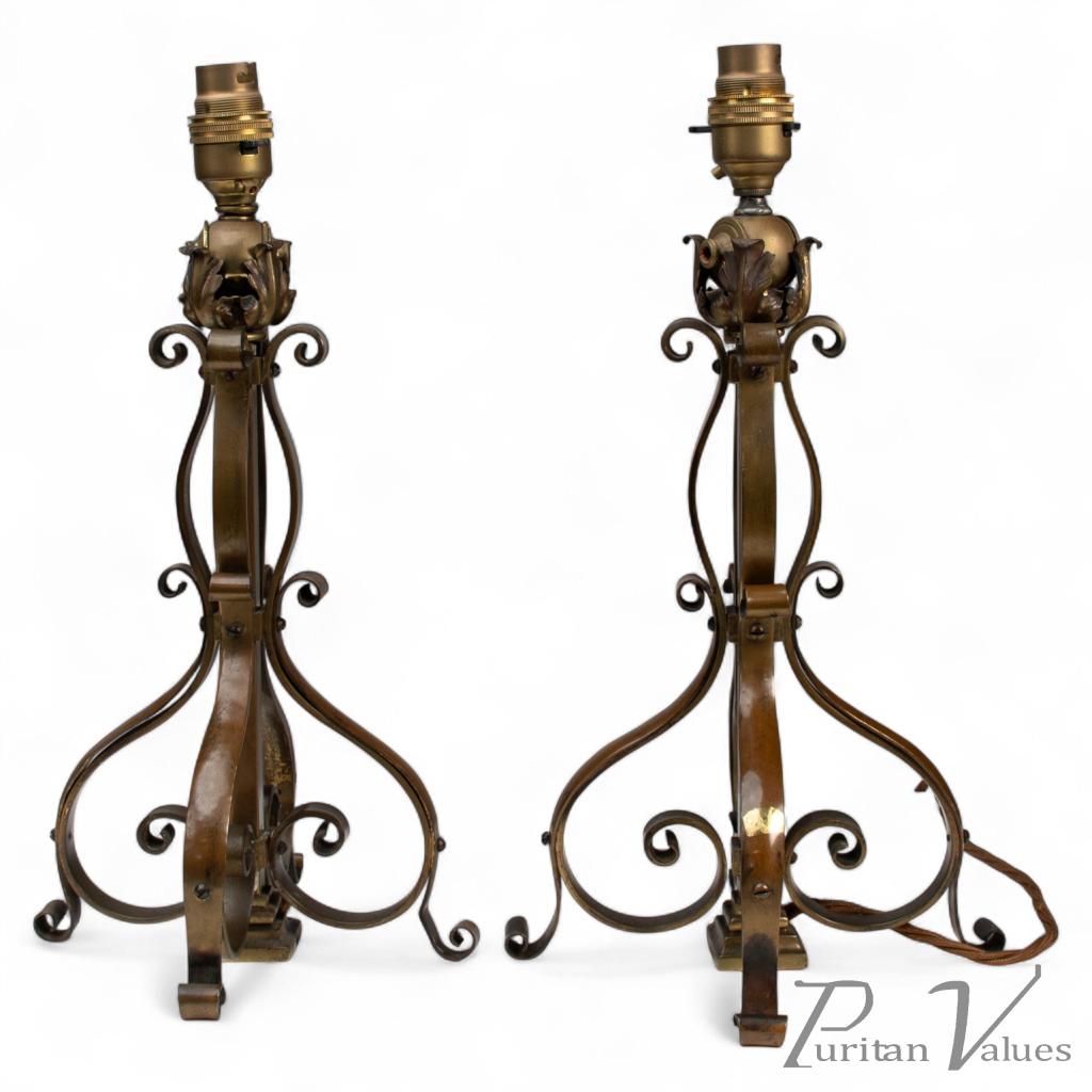 A pair of brass table lamps aligned to the Arts and Crafts movement (1880–1910), c.1910. Each has a four-legged base formed from broad strap brass that rises in S-curves to scroll feet, the legs tied mid-shaft by riveted collars and circling a central lower hub with coiled scrolls. Above, a foliate collar supports the lampholder, giving a compact, stable stance and an open strapwork silhouette suited to desks or side tables. The brass surface presents an even warm tone that complements plain or patterned shades.