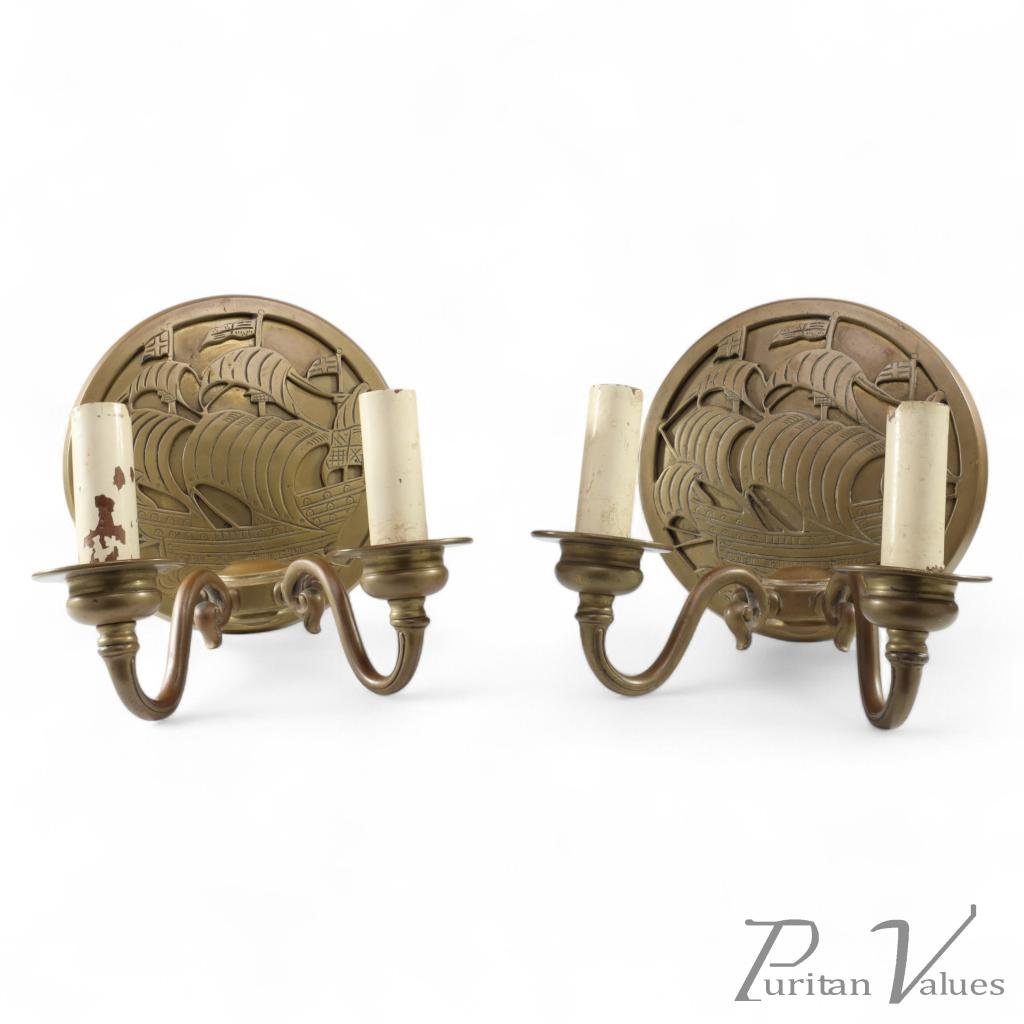 A Pair of Arts & Crafts Brass Wall Lights with Galleons in Sail
