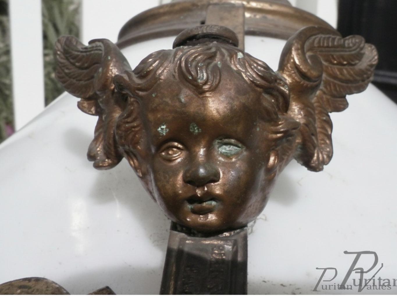 A period brass light fitting with winged cherubs retaining its original white glass shade, retained by brass outer rings.