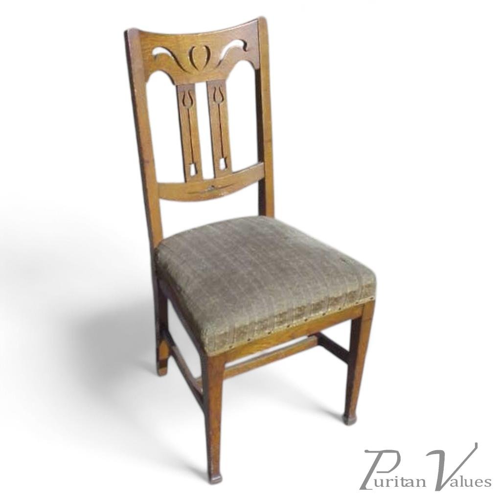 Each chair is constructed in solid plain-sawn oak with a rectangular backrest pierced with stylised floral motifs and paired vertical slats. The upholstered seats rest on straight legs joined by stretchers for stability. The curved crest rail and flowing cut-outs express the hand-carved naturalism typical of late Arts & Crafts furniture, uniting form and decoration in balanced proportion.