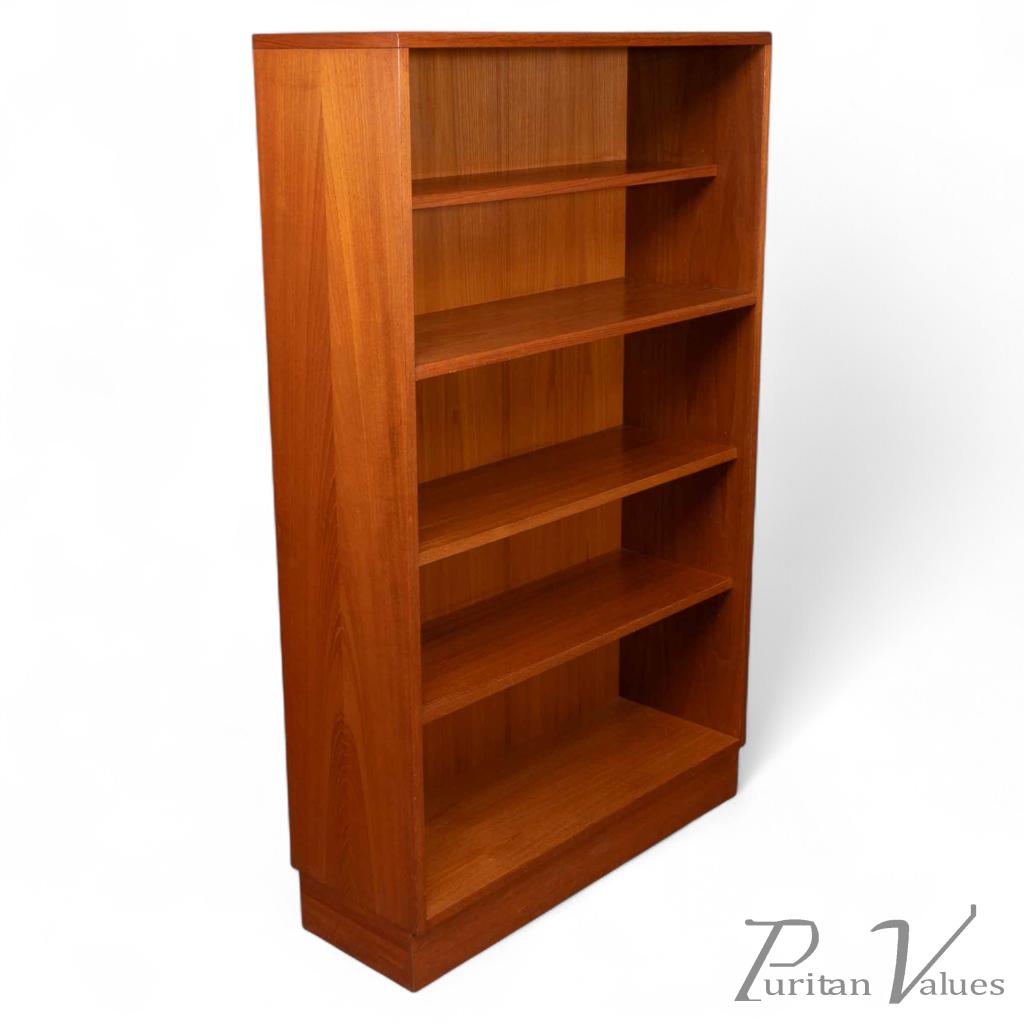 This teak bookcase was made during the Mid-Century Modern period (1945–1970), reflecting the minimalist design sensibility that defined post-war interiors. The tall rectangular frame stands on a plinth base and is fitted with five fixed shelves, the uppermost set back slightly to create a gentle variation in depth.