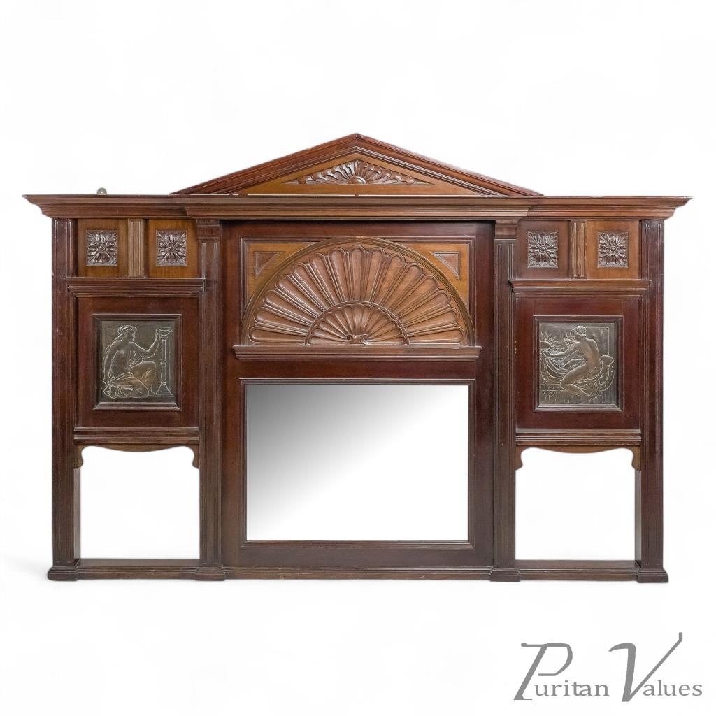 A superior quality Aesthetic Movement carved walnut Overmantel, with bevelled mirror and embossed copper panels depicting classical maidens.