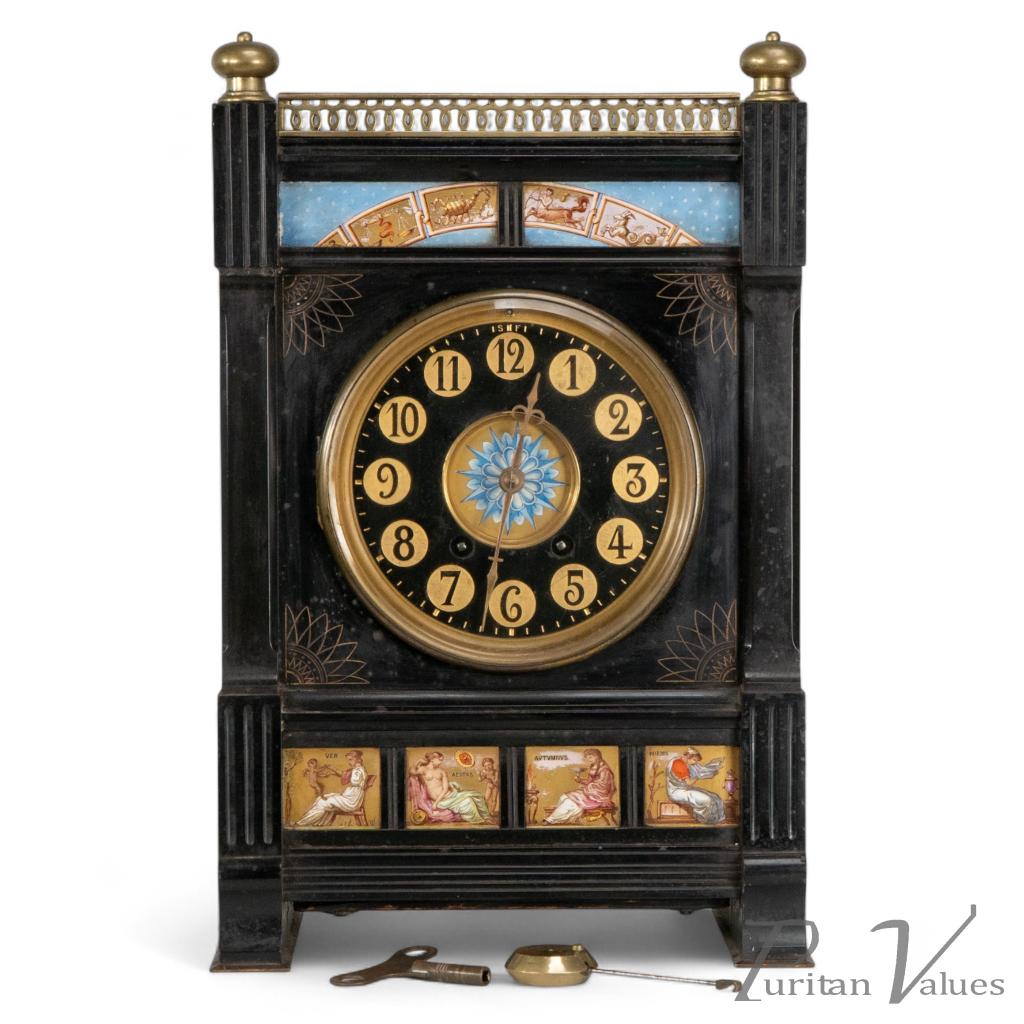 A rare and wonderful Aesthetic Movement black marble brass gong-striking mantel clock with brass finials and brass gallery to the top, just below with hand-painted porcelain panels of the signs of the Zodiac and an Arabic numeral 6.5 inch dial with hand-painted sunburst to the centre flanked with quarter florets to each corner.