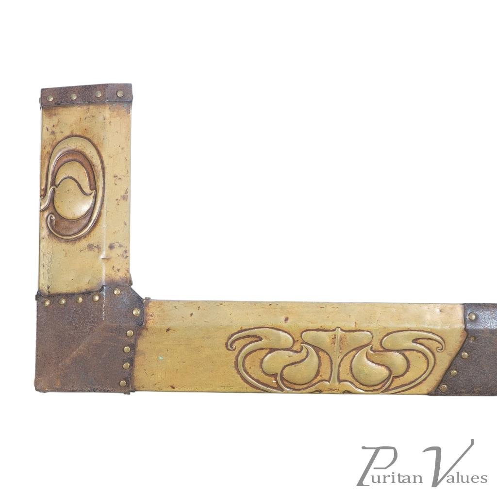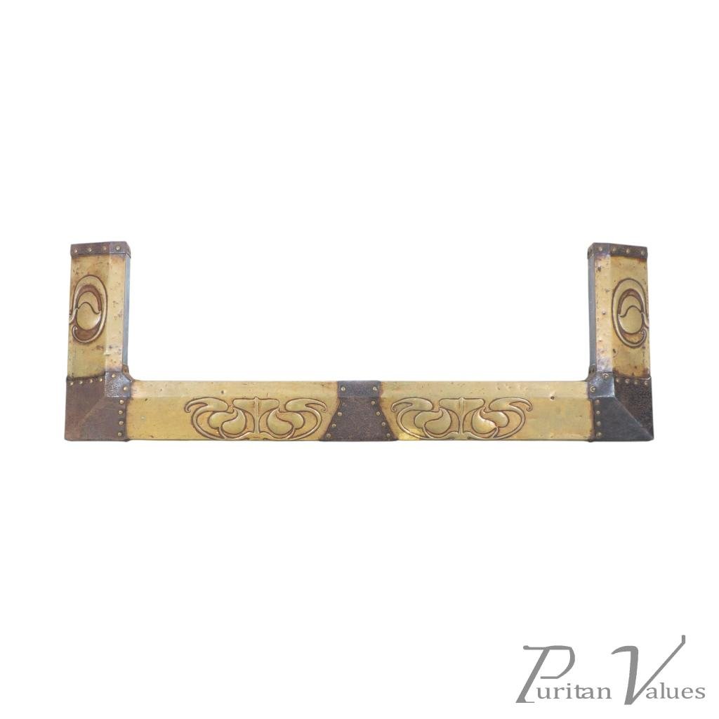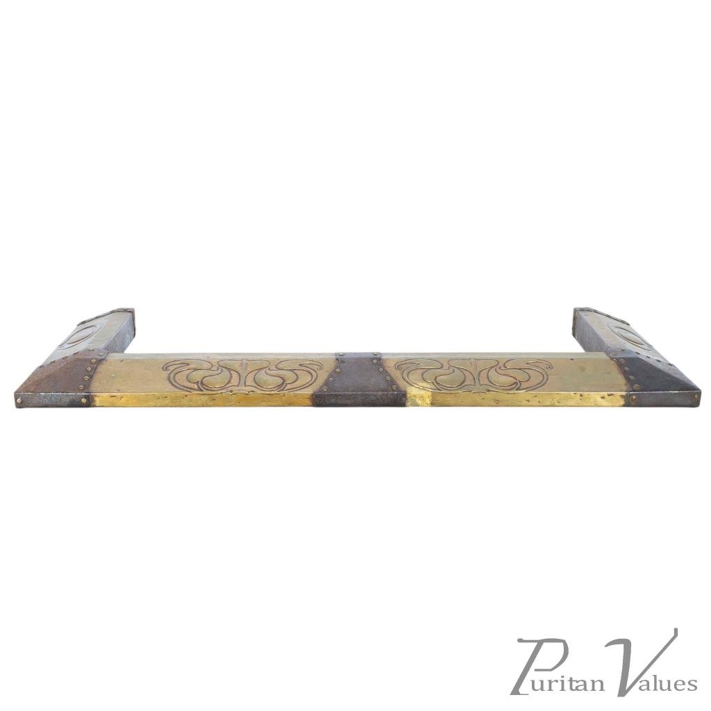 Fireplace fender in copper, brass and iron from the Arts and Crafts movement (1880–1910), c.1900. The rectilinear structure encloses the hearth on three sides with upright ends and a central span of hand-formed repoussé panels decorated with stylised floral motifs. Riveted corner braces in contrasting iron strengthen the joins and provide tonal variation across the metals.