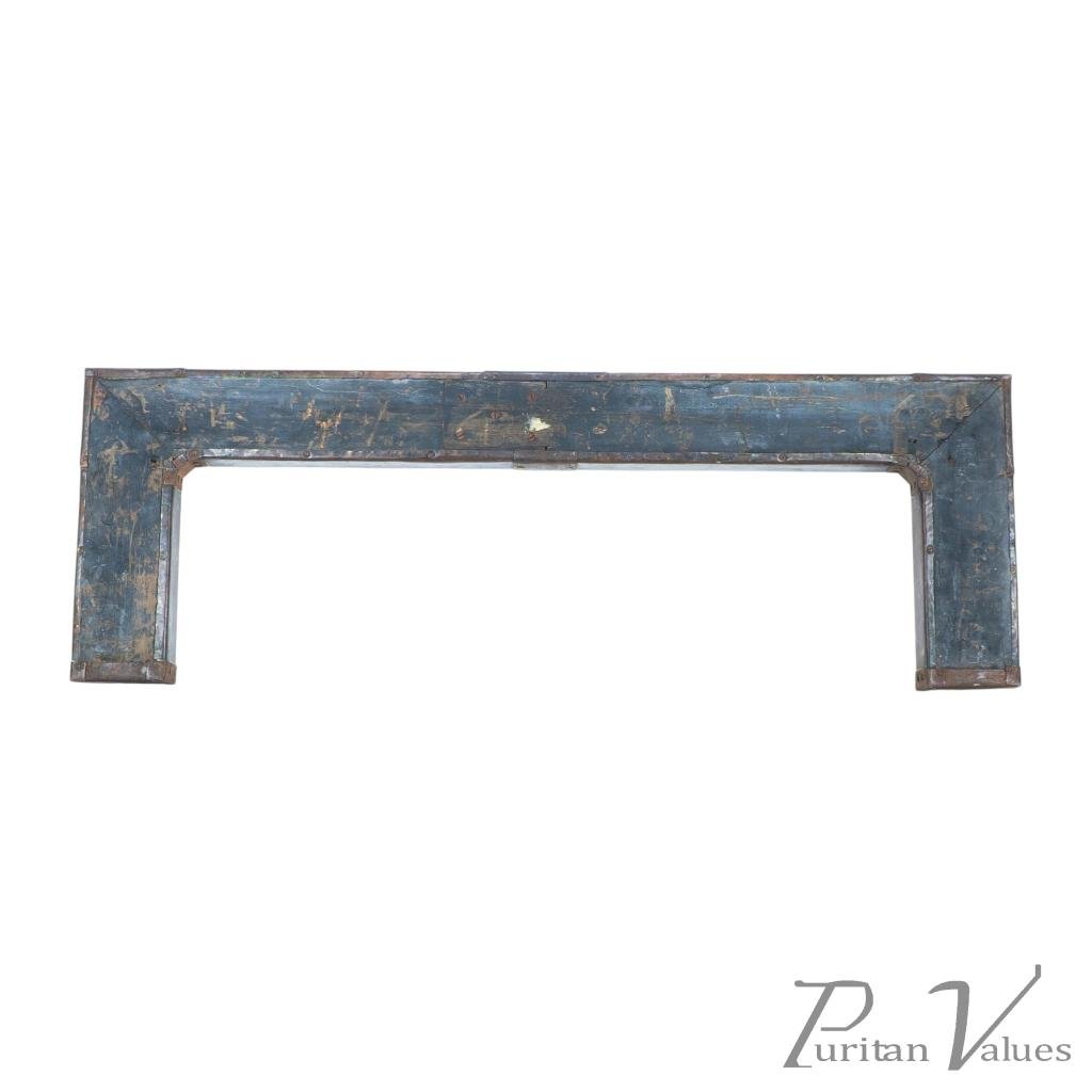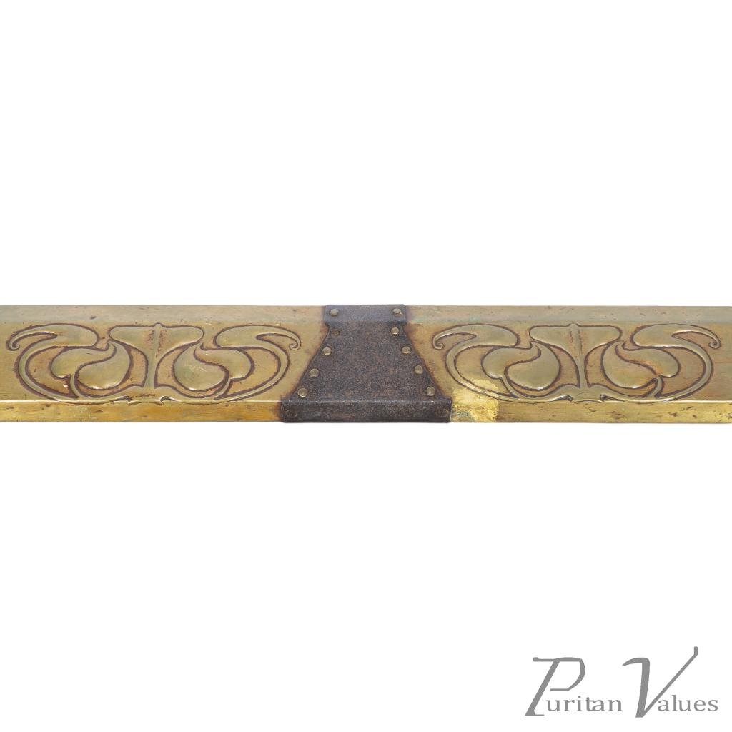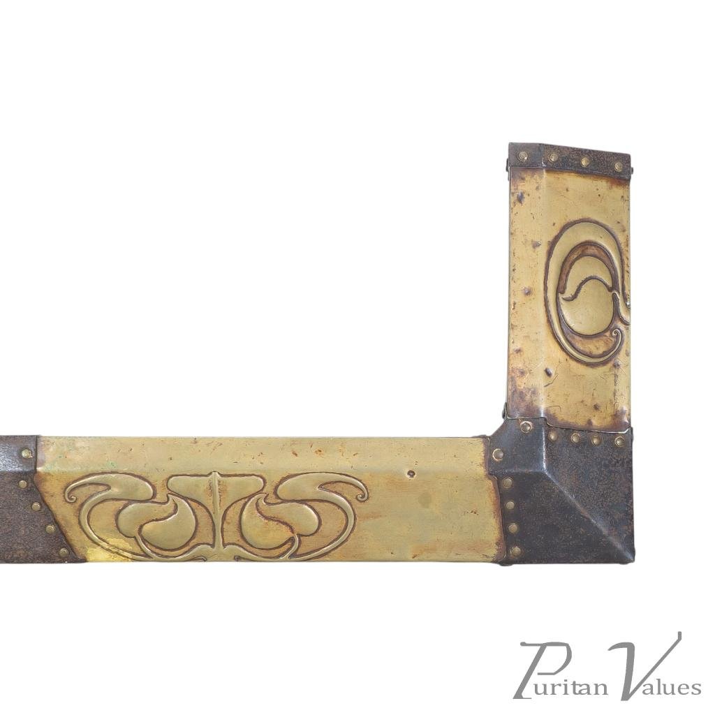 Fireplace fender in copper, brass and iron from the Arts and Crafts movement (1880–1910), c.1900. The rectilinear structure encloses the hearth on three sides with upright ends and a central span of hand-formed repoussé panels decorated with stylised floral motifs. Riveted corner braces in contrasting iron strengthen the joins and provide tonal variation across the metals.