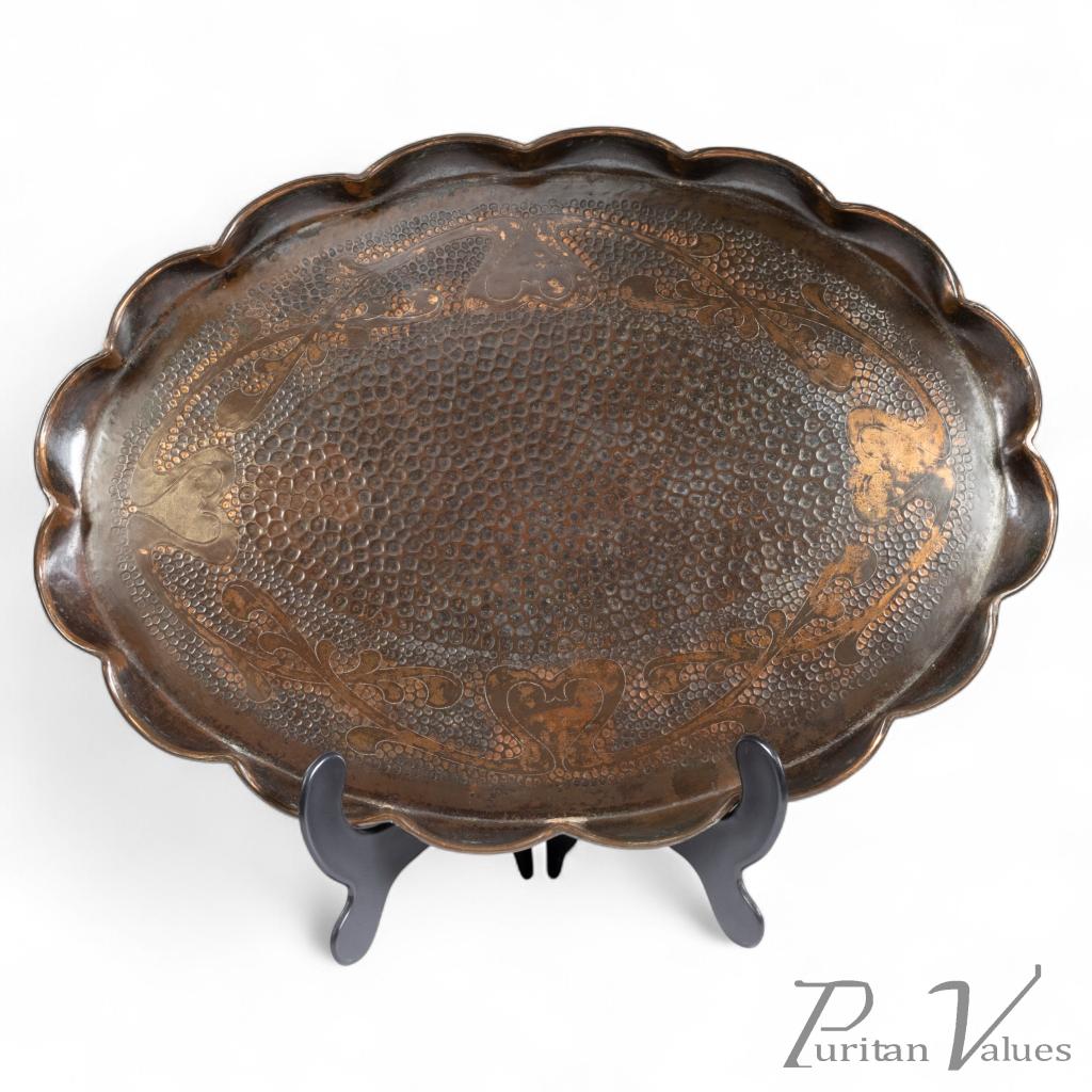 An oval copper tray dating to c.1910, designed in the Arts and Crafts Movement style. The surface is hand-hammered and decorated with a repeating foliate and floral motif in repoussé relief, bordered by a scalloped rim with neatly folded edges. The craftsmanship reveals the emphasis on decorative simplicity and honest construction central to the movement. The aged patina enhances the warm tone of the copper, highlighting the intricate handwork and subtle variation across the hammered surface.