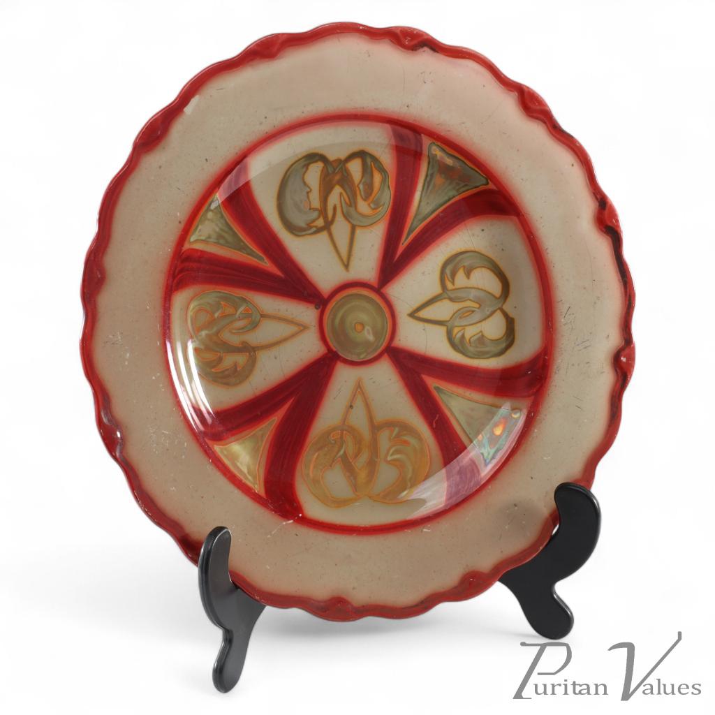 W. H. Grindley & Co. An Arts & Crafts decorative plate hand-painted in red, gold, and green with stylised foliate motifs radiating from a central medallion. The surface displays a fine iridescent lustre typical of early twentieth-century decorative pottery, reflecting the movement’s interest in handcraft and colour harmony. Marked to the underside.
