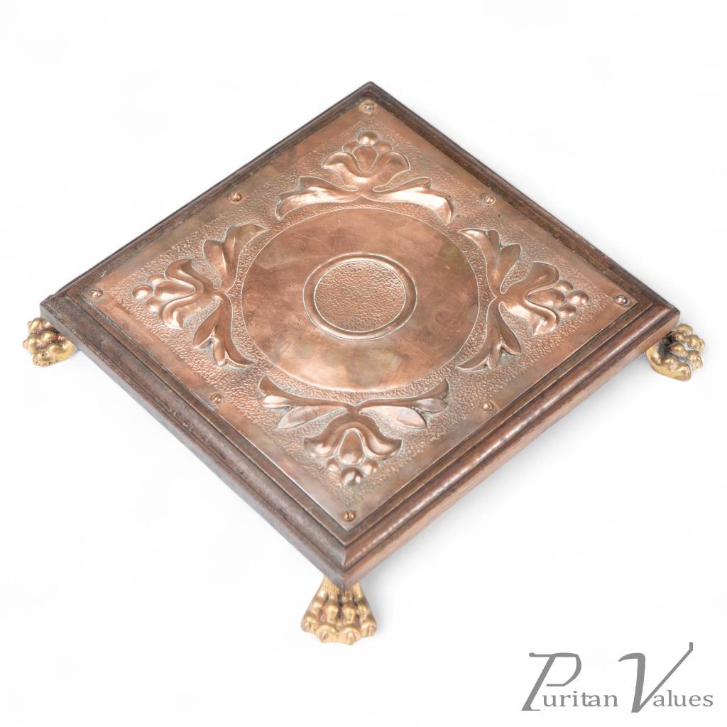 An Arts and Crafts copper and oak teapot stand or trivet, with hand formed floral decoration to the square plate, which is applied to a square oak base with brass lion paw feet.