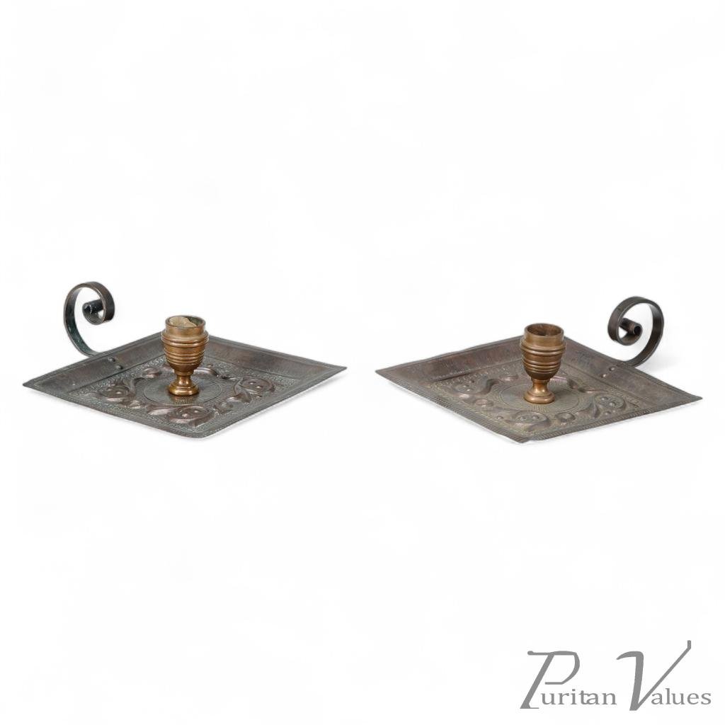 A pair of Arts and Crafts copper night candle holders, with hand formed floral decoration to the square bases, and extended scrollwork handles. Both stamped with the Benham and Froud makers mark to the underside of the scroll work handles.