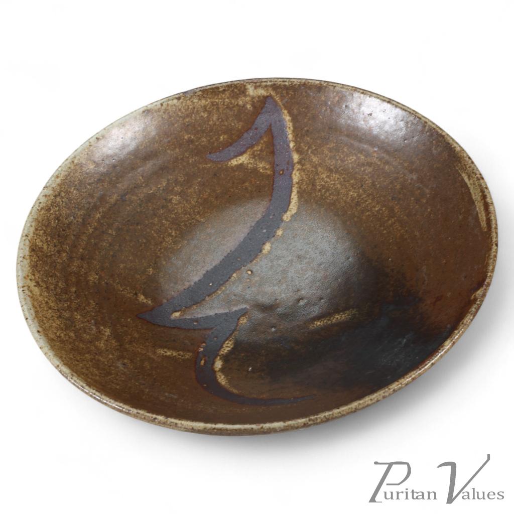 A Japanese inspired reduced stoneware bowl with brown glaze to the interior and a calligraphy stroke in black, and a beige speckled glaze to the exterior.