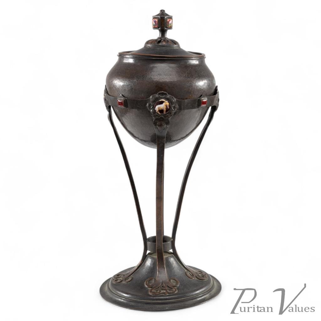 A rare English Arts & Crafts patinated hand-hammered brass chalice, with matching removable bowl and lid with enamel decoration. The stand stood on a circular base with applied hand-formed scrollwork details that rise up and open out to an upper ring at the top of the stand with three enamels, two enamels depicting Rams. The Ram represents the power to penetrate, overcome, and achieve. It reflects the assertion of strength in creative ways to achieve a breakthrough.