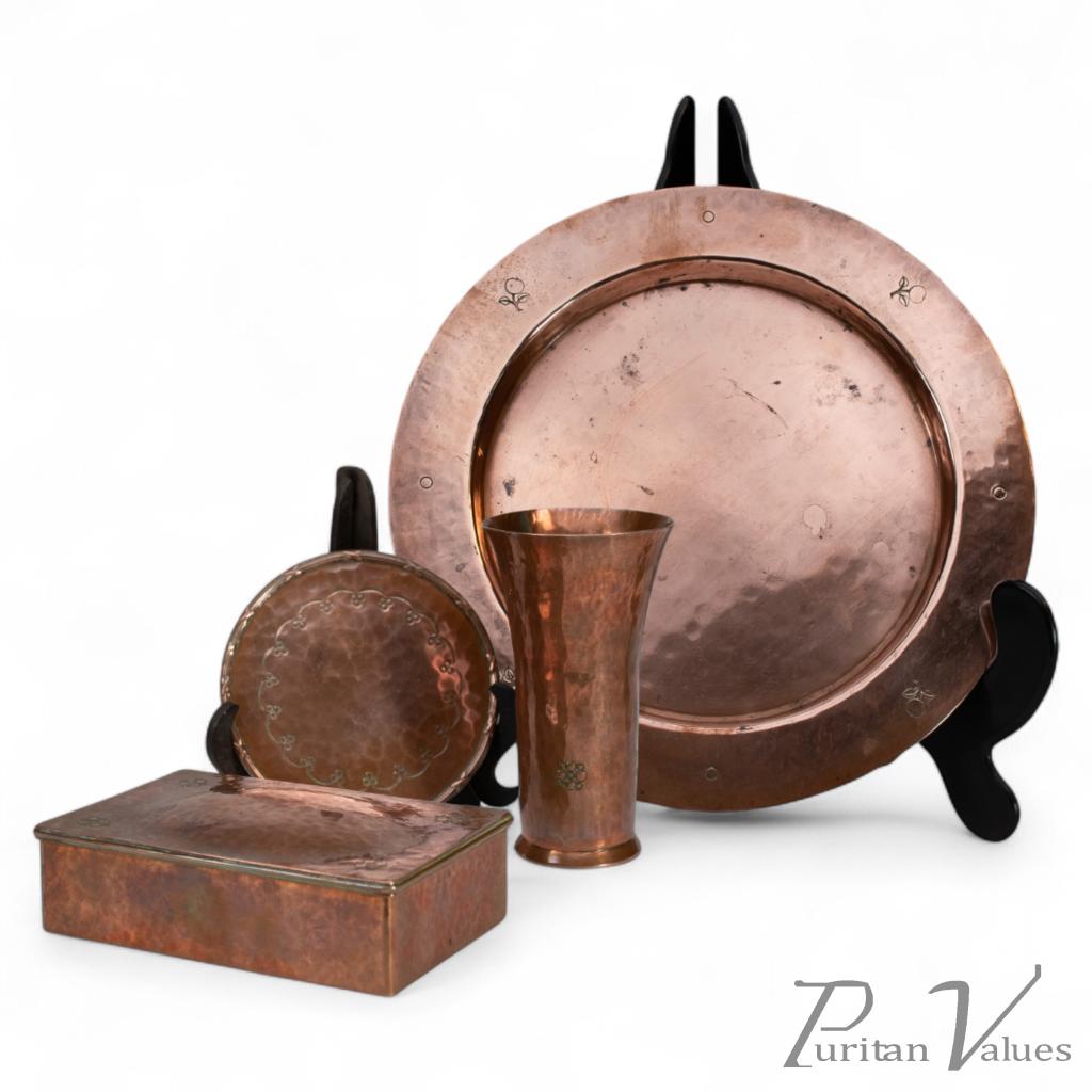 An Arts & Crafts four piece beautifully hand-hammered dressing table or desk set consisting of a copper jewelry box with a domed lid and incised floral circular motifs to each corner of the lift-up lid, unsigned.
