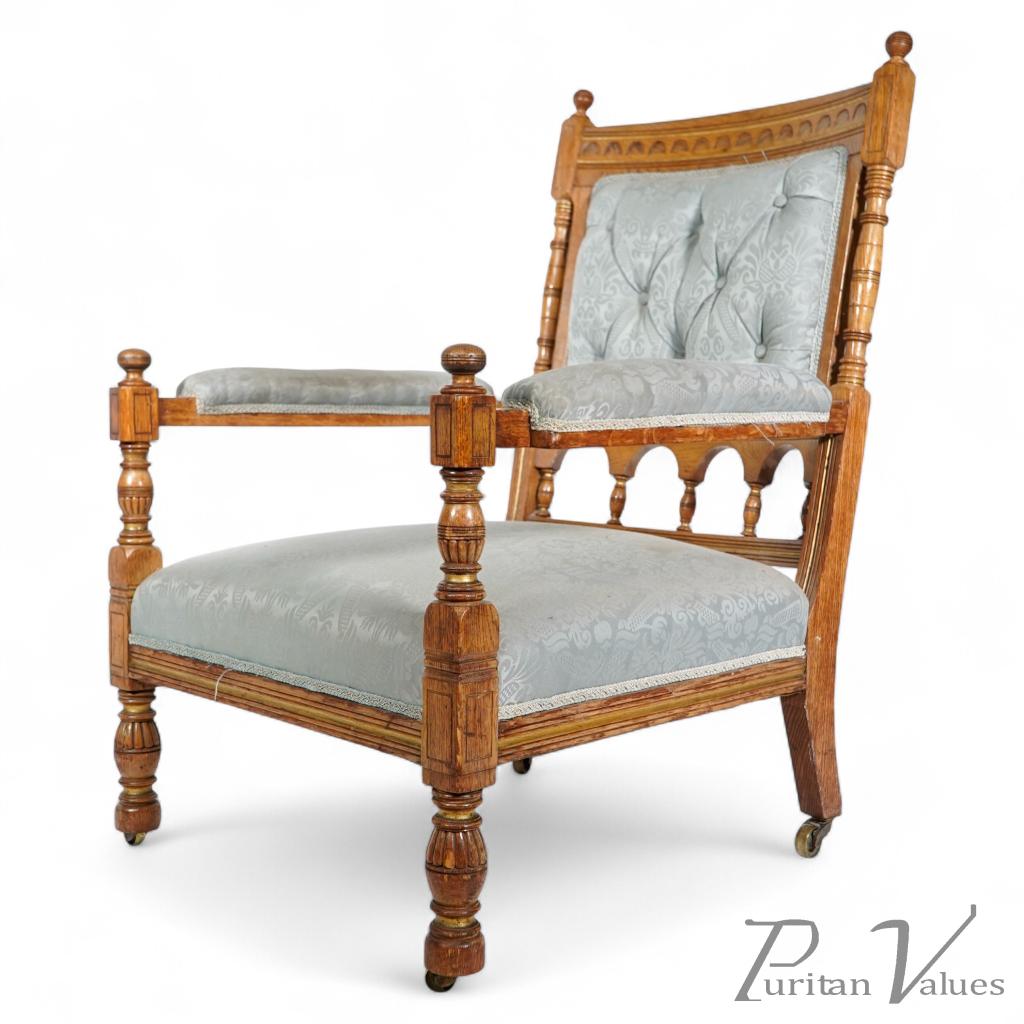 Oak armchair attributed to Bruce Talbert and stamped by Gillows c.1880, Aesthetic Movement, with carved arches, turned legs, and blue damask upholstery.