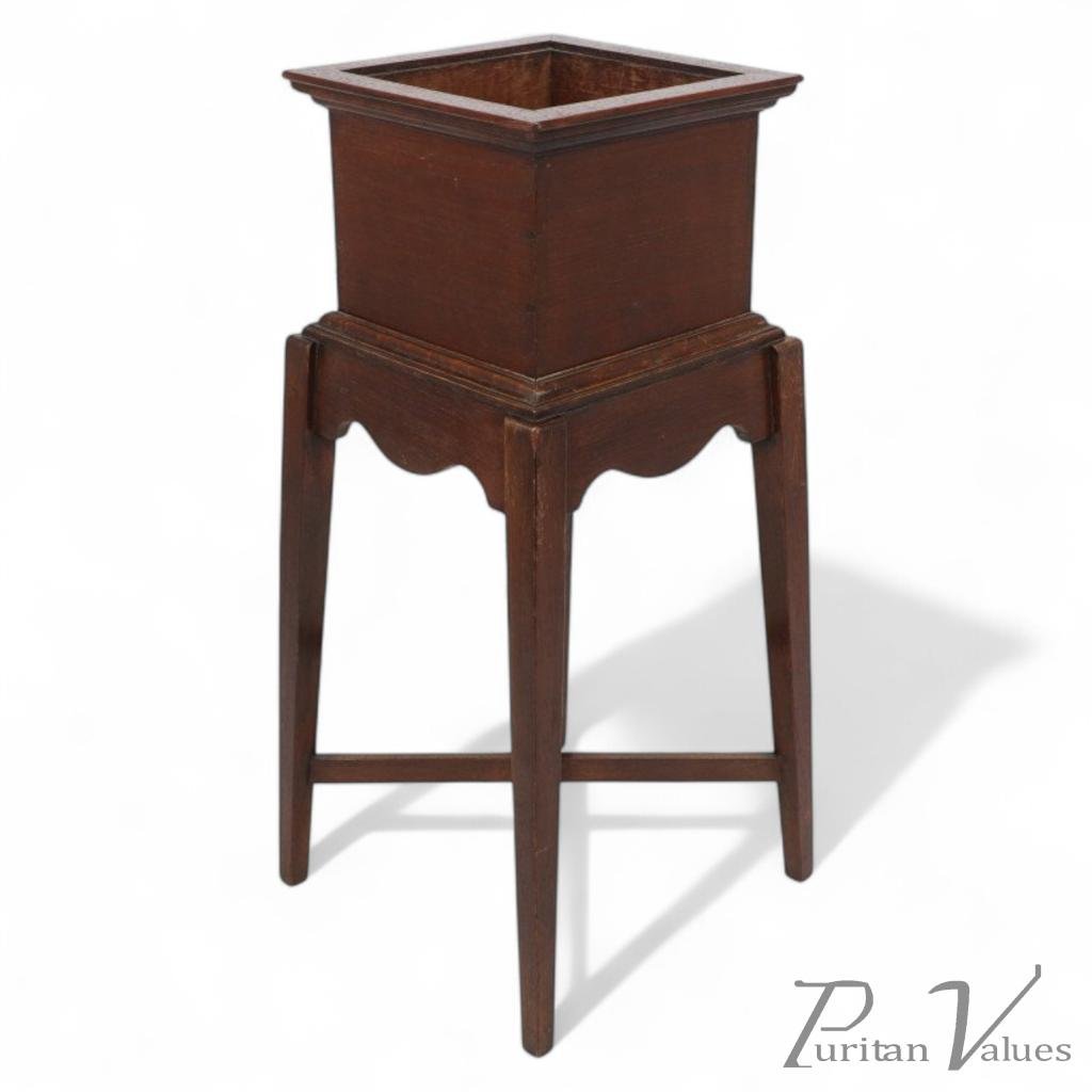 A small Arts and Crafts oak plant stand. The box top is removable and has a copper stand fixed to the inside to raise the plant and to allow drying if over watered. A Voysey shaped apron with simple tapering legs united by a cross stretcher.