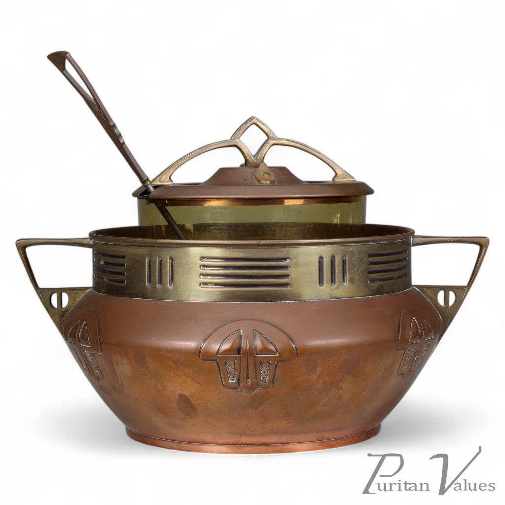 An early Secessionist style copper and brass punch bowl and lid with original green glass liner and a ladle.