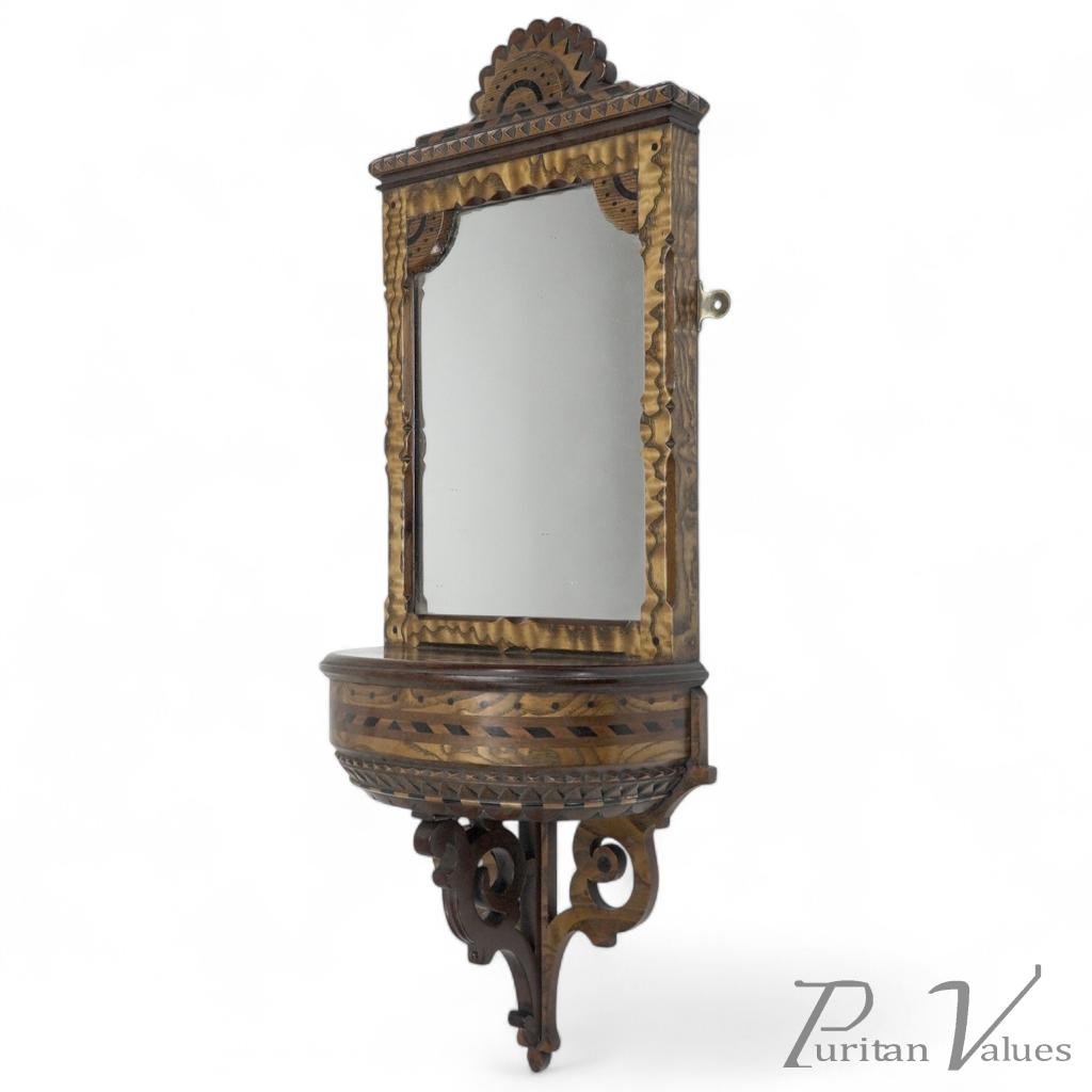 The main body looks to be made from Hungarian Ash with a floral crown made from Walnut to the upper back, then Satinwood crowned with chevron details and ebonized dots and conforming semi-circular inlaid ebonized details, with quartered conforming details to the top mirror corners.