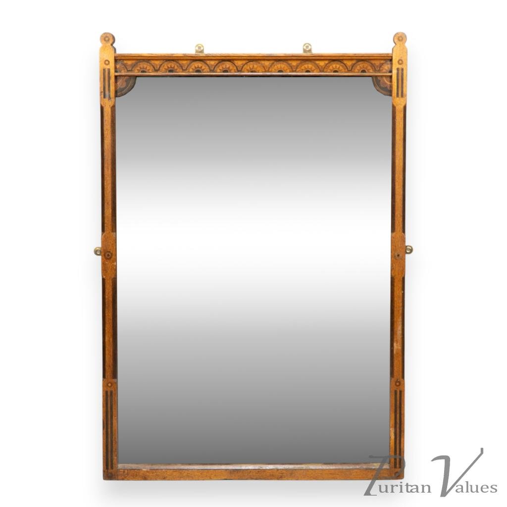 In the style of Charles Bevan, a wall mirror in oak, aligned to the Gothic Revival movement (1830 to 1900), c.1880. The rectangular plate is held in a slim chamfered frame, the uprights set with vertical line and dot inlay and triple bars at the terminals, the top frieze worked with a repeating sunrise arcade over small shaped corner brackets. Brass hanging eyes are fitted along the top edge and discreet side fixings sit mid-stile, giving a clean, geometric presentation consistent with Bevan’s disciplined vocabulary.