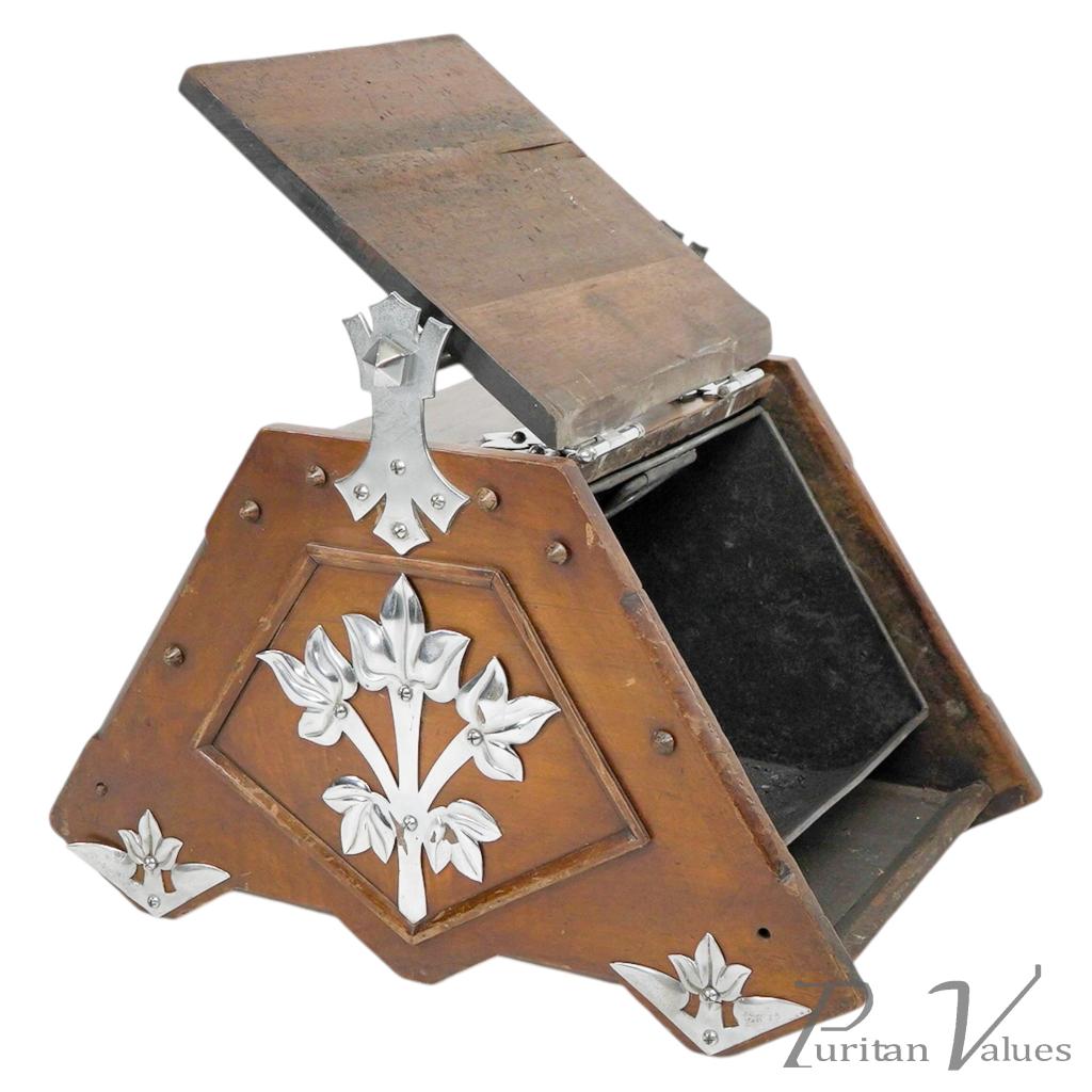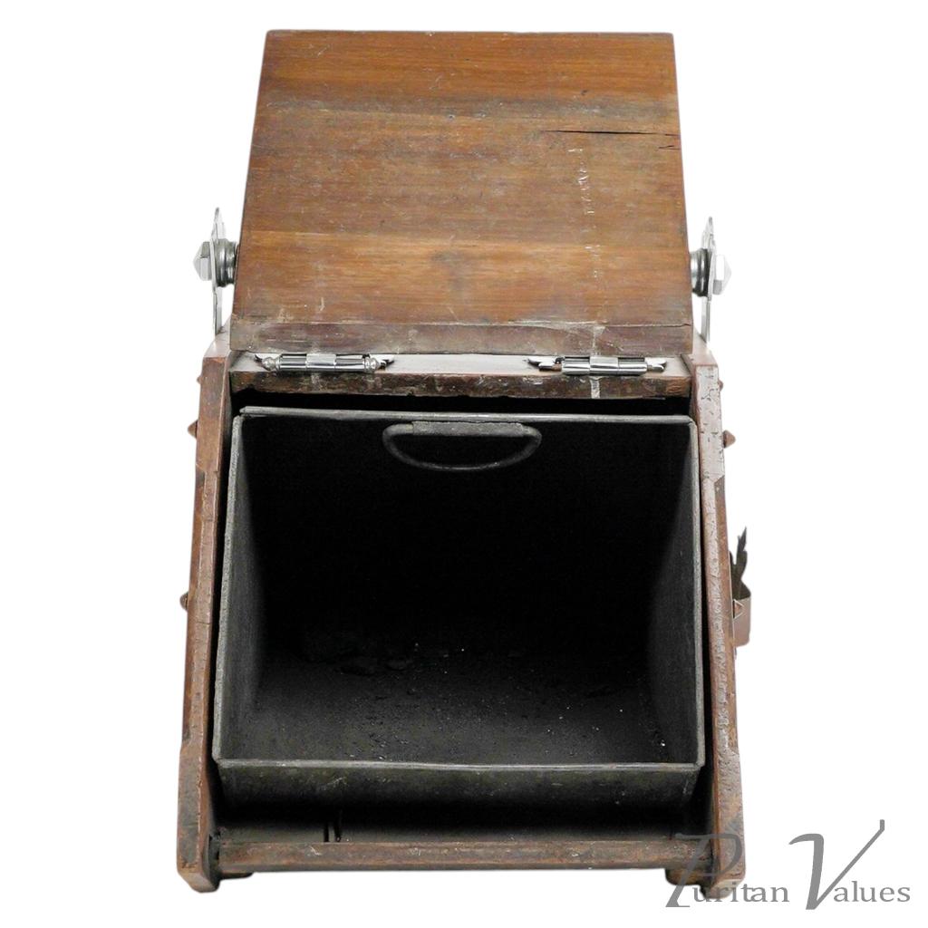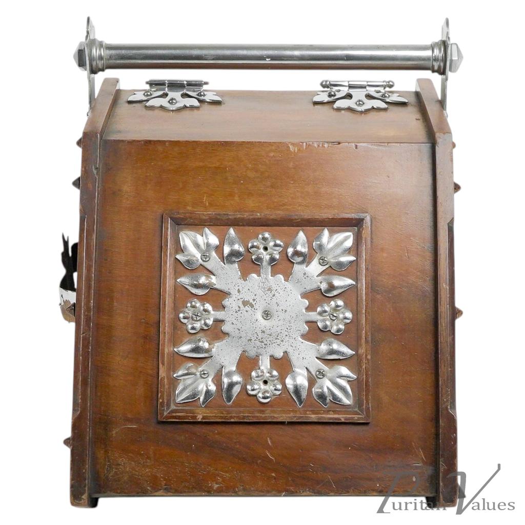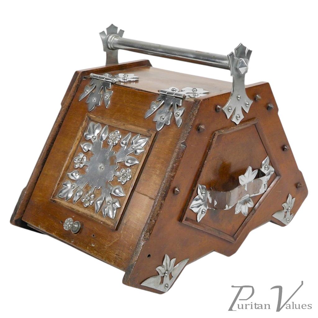 Made by Benham and Froud. An Aesthetic movement walnut coal scuttle with applied chrome-plated stylized carry handle and foliate decorative mounts and a side holster to hold a coal shovel.