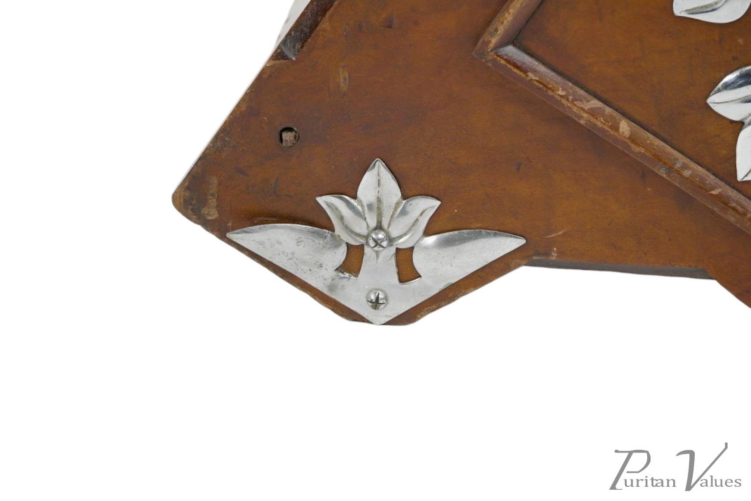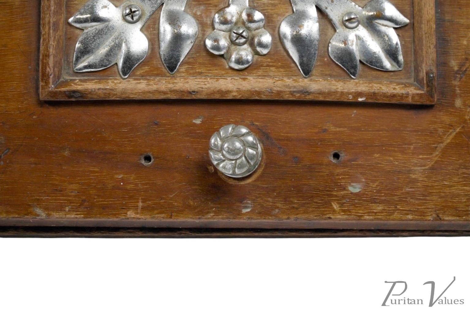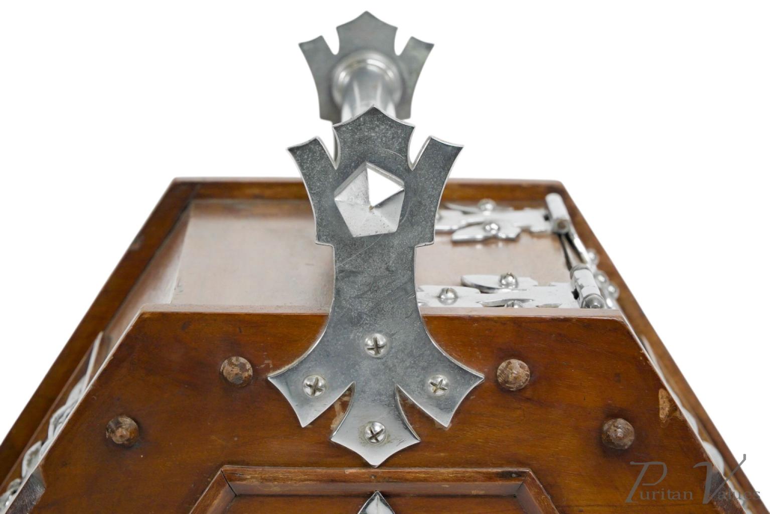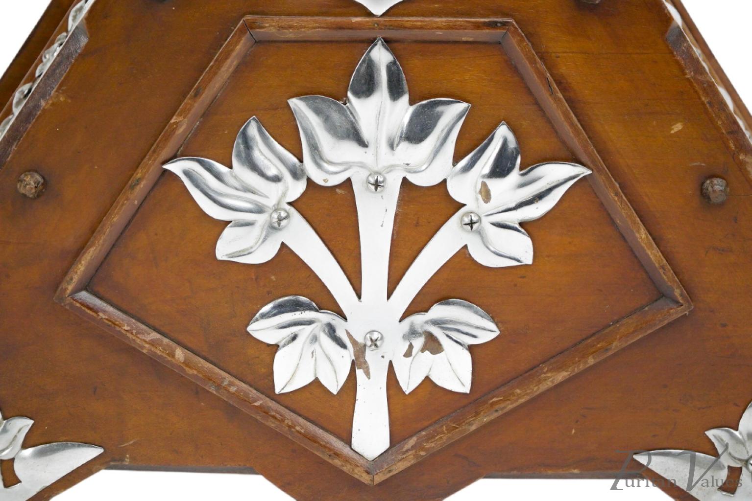 Made by Benham and Froud. An Aesthetic movement walnut coal scuttle with applied chrome-plated stylized carry handle and foliate decorative mounts and a side holster to hold a coal shovel.