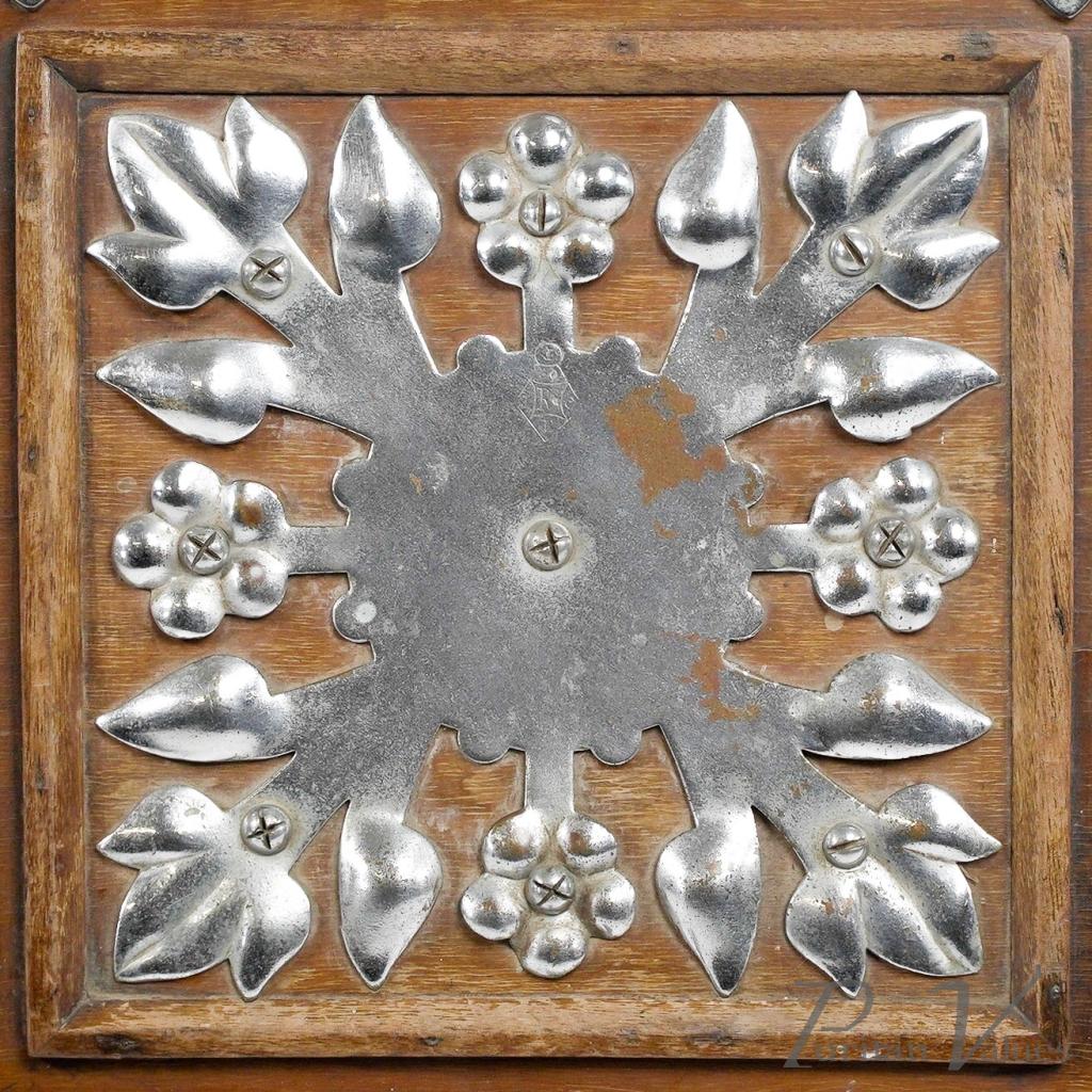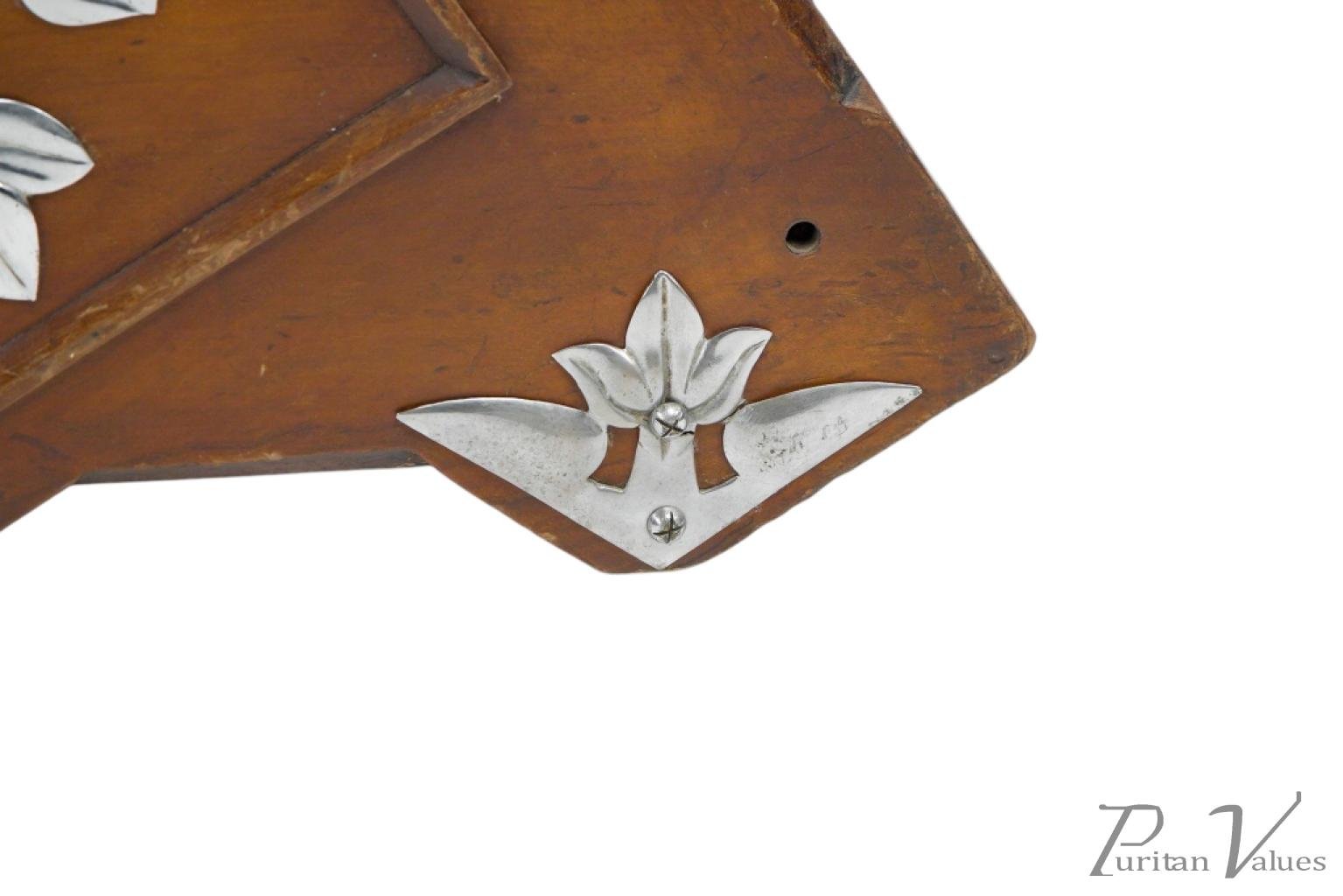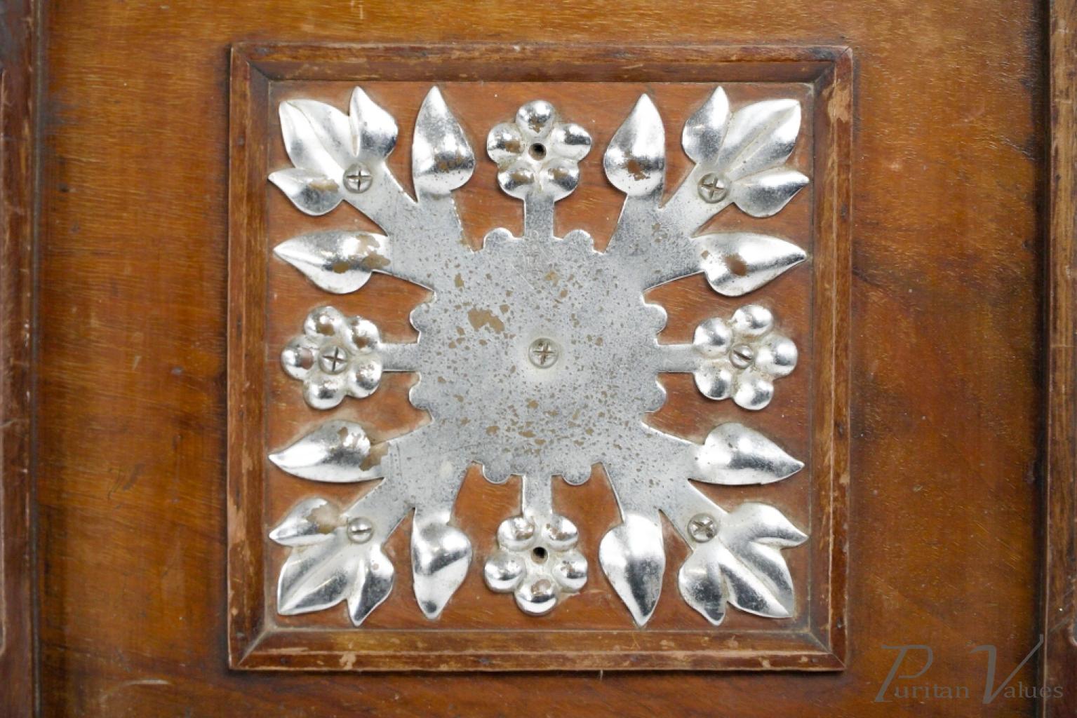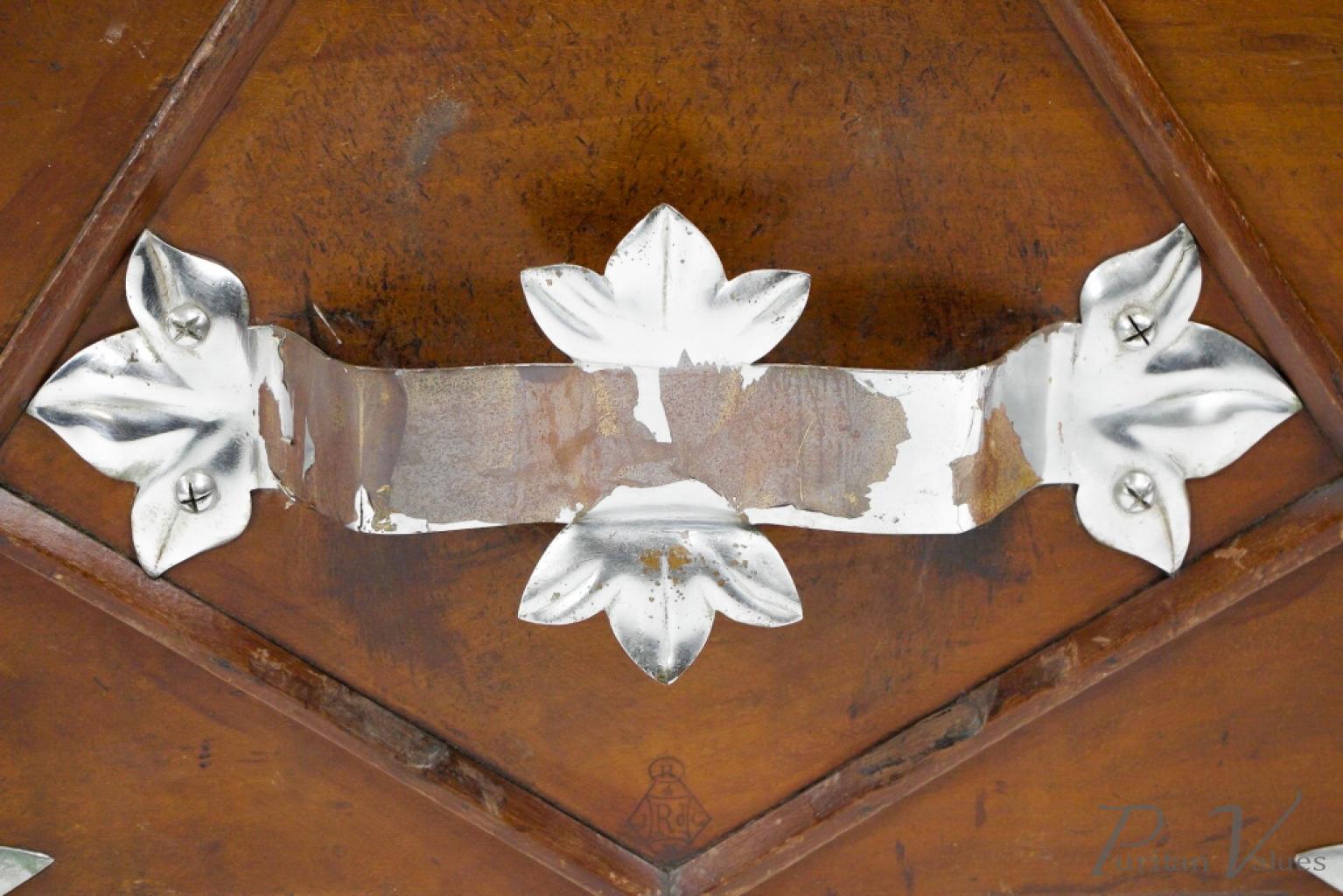 Made by Benham and Froud. An Aesthetic movement walnut coal scuttle with applied chrome-plated stylized carry handle and foliate decorative mounts and a side holster to hold a coal shovel.