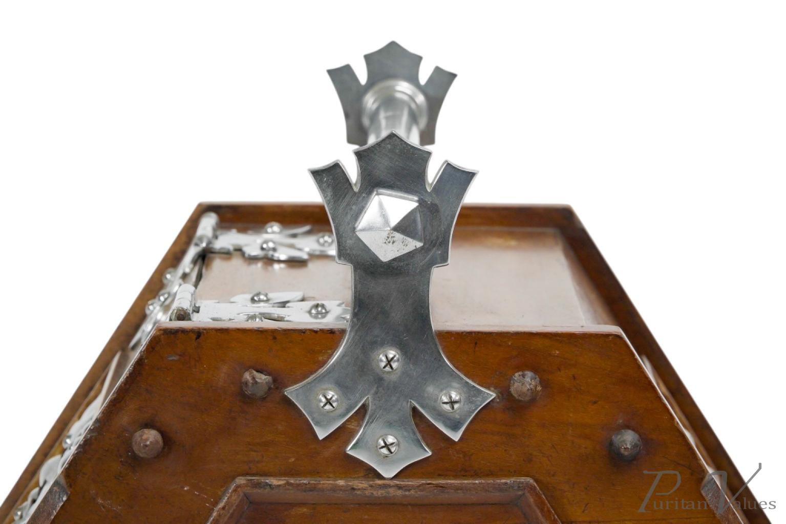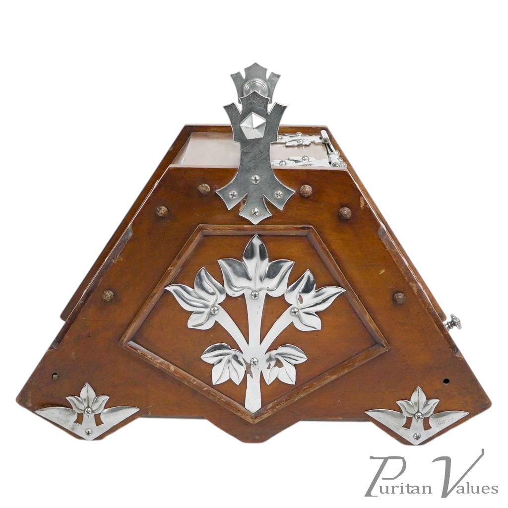 Dr. C. Dresser, attributed. Aesthetic Movement Walnut Coal Scuttle with Stylized Mounts