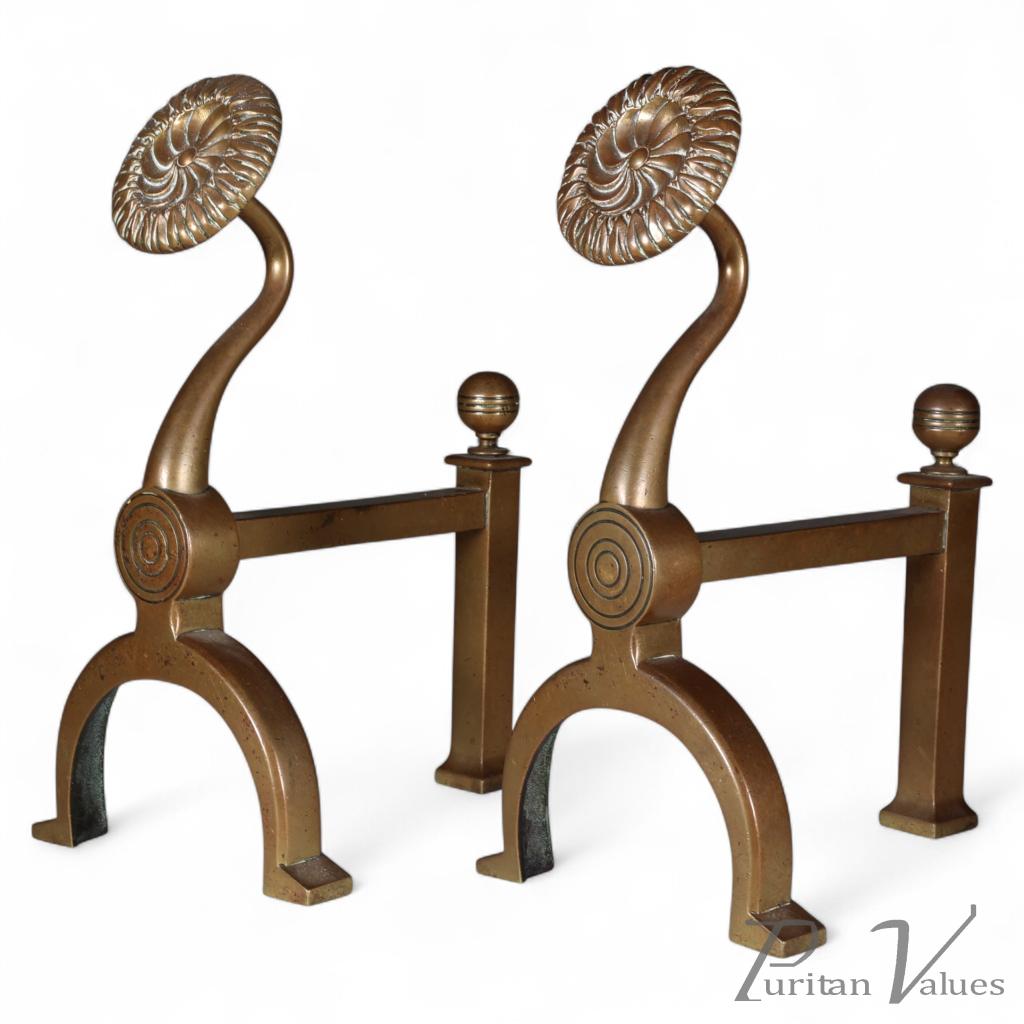 A pair of Aesthetic Movement brass fire dogs with sunflowers on elegant shaped necks.
