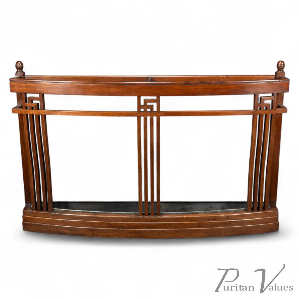 A slim Aesthetic Movement Walnut umbrella and stick stand with turned finials to the back and Anglo-Japanese style fretwork decoration to the front. Stood on a graduating base and retaining the original drip tray.