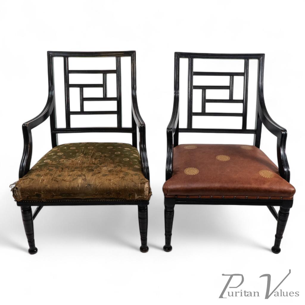 E. W. Godwin, attributed. Two Anglo-Japanese Aesthetic Movement Ebonized Armchairs