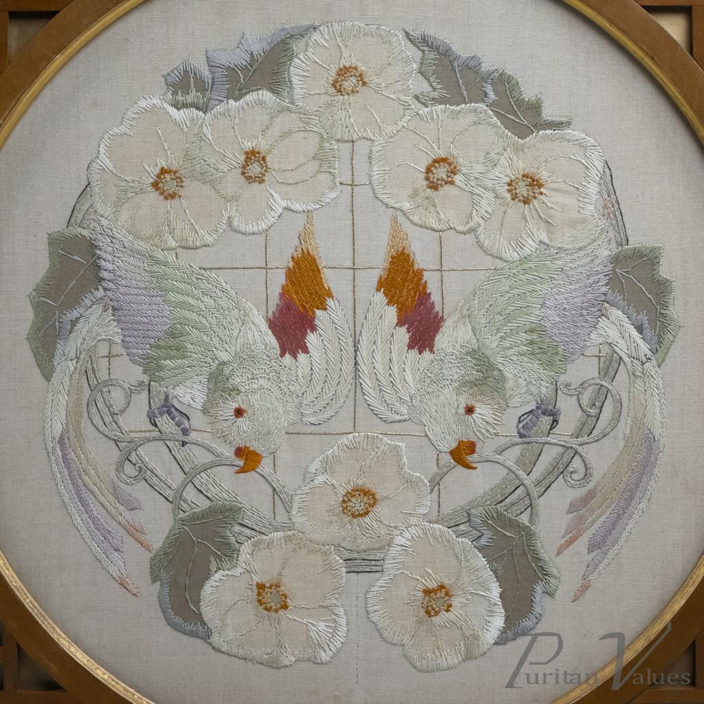 In the style of an Anglo-Japanese designed fire screen, with a stepped top rail and a Japanese silk embroidery depicting a pair of parrots or parakeets amongst floral decoration, set in a circular gilt edge frame with Japanese blind fretwork decoration to each corner, stood on raised stepped feet.