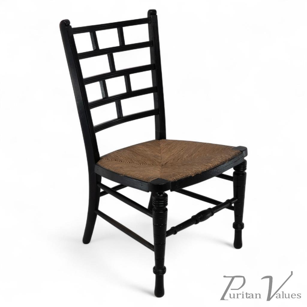 In the style of E. W. Godwin. An Anglo-Japanese side chair with an ebonised frame, turned front legs, and lattice back rails above a triangular rush-woven seat. The design displays the geometric precision and linear restraint associated with Edward William Godwin and the early Aesthetic Movement, combining Japanese influence with functional simplicity characteristic of British design in the 1870s.