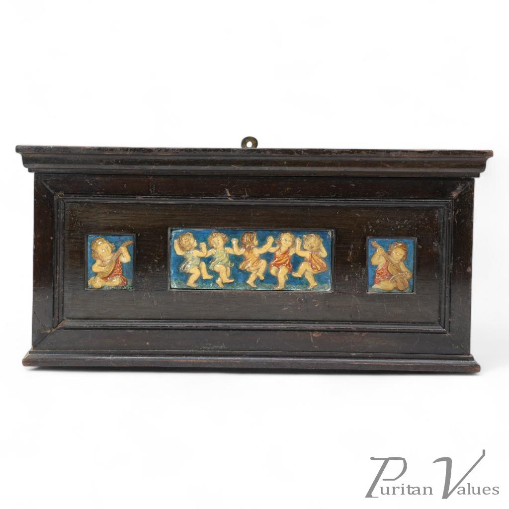 A small picture frame with three plaster plaques in their original ebonized frame. Depicting a child playing the lute to the left-hand plaque, dancing children to the centre plaque, and a child playing the double bass to the right-hand plaque.