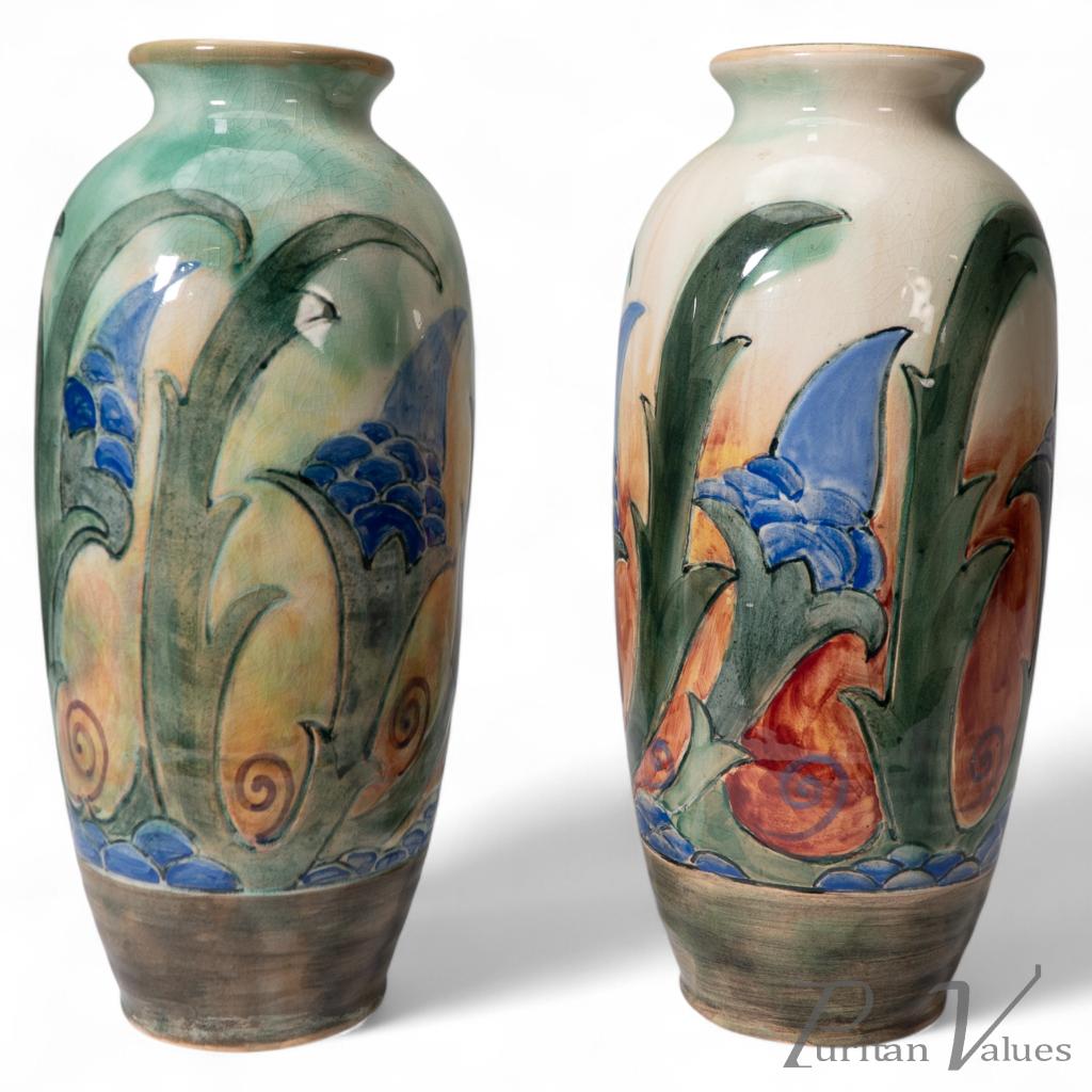A pair of hand-painted vases designed by Frank Brangwyn for Royal Doulton. Each vase is decorated with stylised floral motifs in rich tones of blue, green, and russet, characteristic of Brangwyn’s bold and expressive approach to design. These vases highlight the collaboration between one of Britain’s foremost artists and one of its leading ceramic houses, combining painterly surface detail with the technical excellence of Royal Doulton’s production.