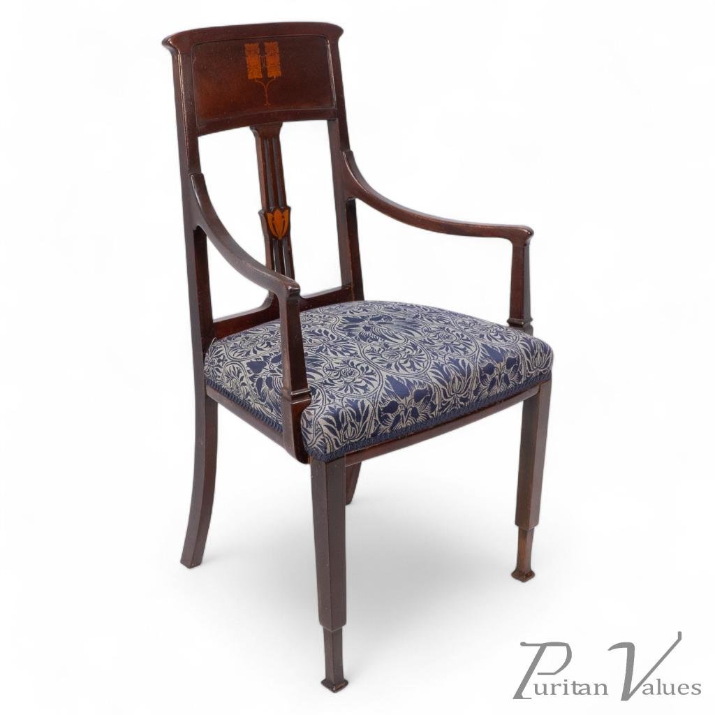 An English Arts and Crafts mahogany armchair with stylized floral inlaid decoration with Thebes style feet.