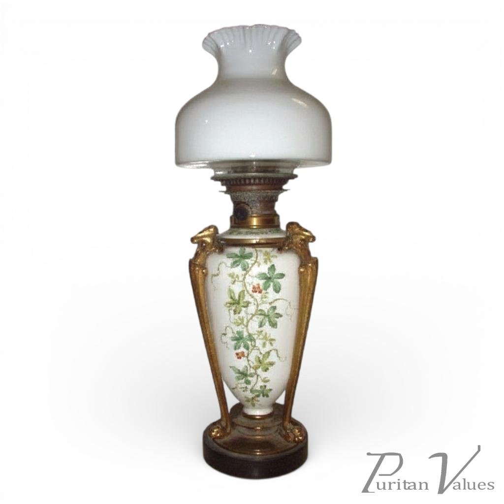 A high quality oil lamp with a hard paste porcelain reservoir hand painted with delicate fruiting berries and foliage, embraced by three large gilt bronze cat pillars terminating with paw feet. The oil reservoir and burner slide out in one. With its original Hinks & Sons burner. Height 25".