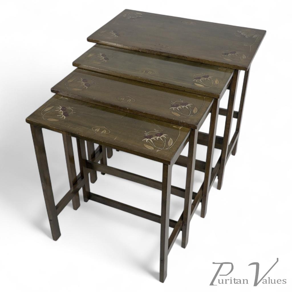 Glasgow School. A Rare Nest of Four Side Tables Each Top Surface Hand Painted with Stylized Floral Decoration