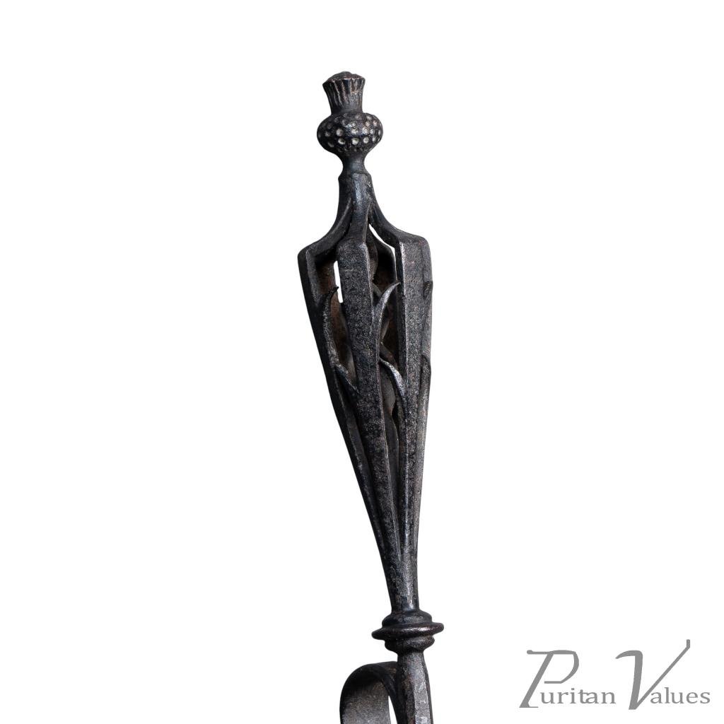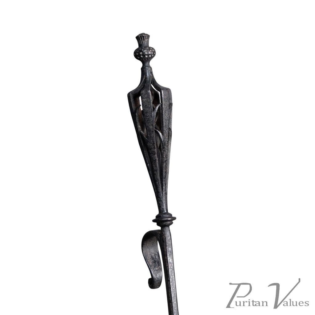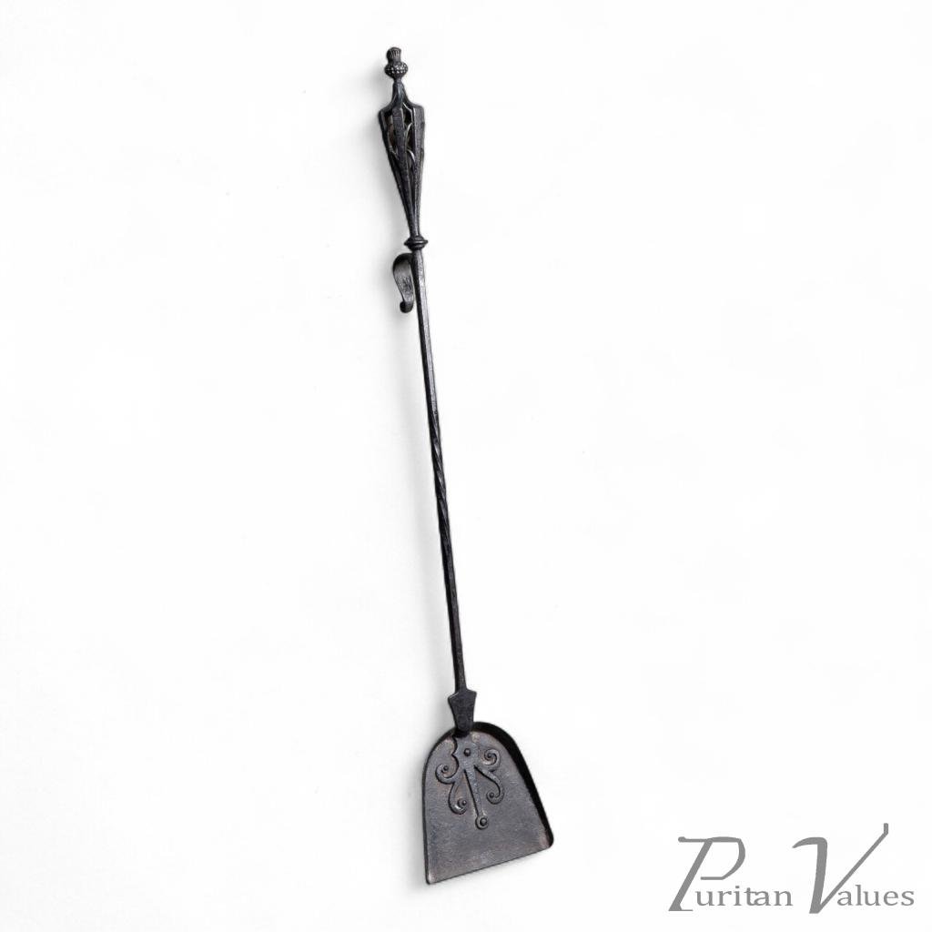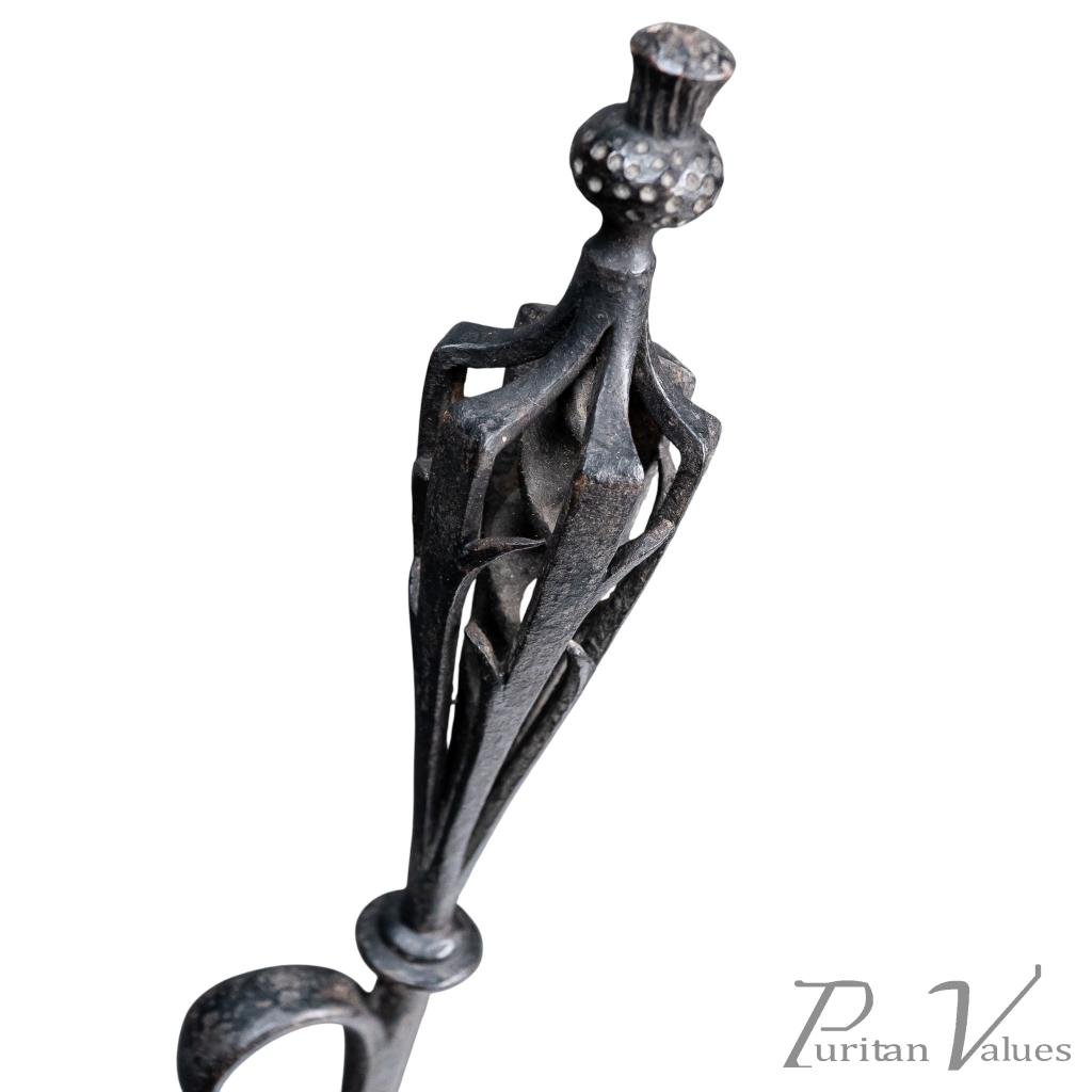The handle terminates in a finely modelled thistle finial, beneath which an open fretwork section depicts interlacing flame-like tendrils, enclosing a central twisted rod. This structural and decorative interplay captures the Guild’s belief in the visible expression of labour within design. The main shaft, of hammered steel, is detailed with a rat-tail scroll for hanging and a twisted mid-section that transitions into the shovel head.