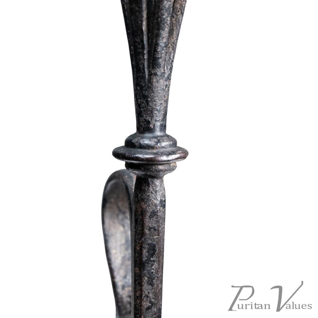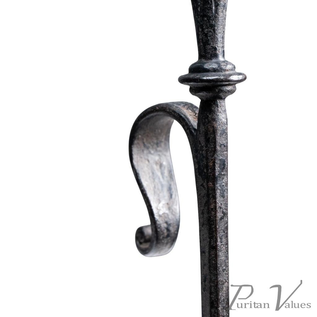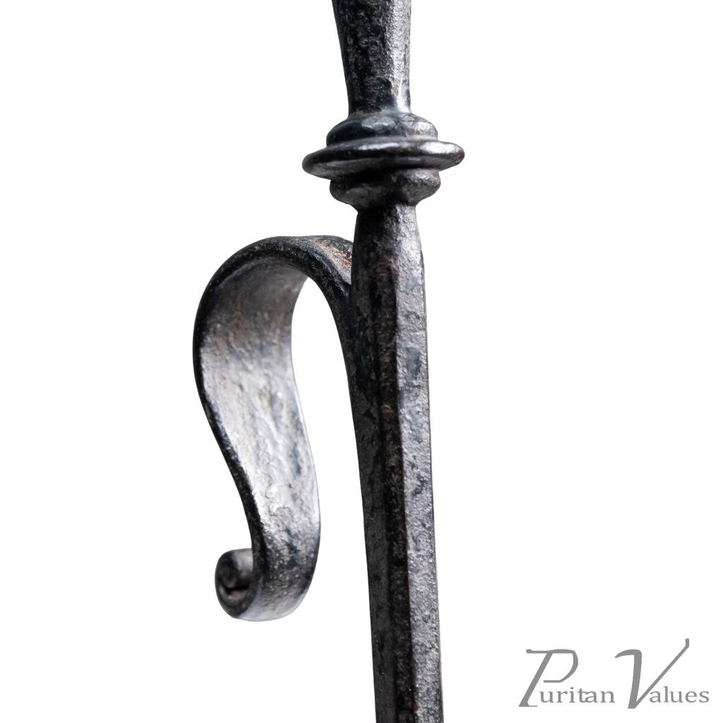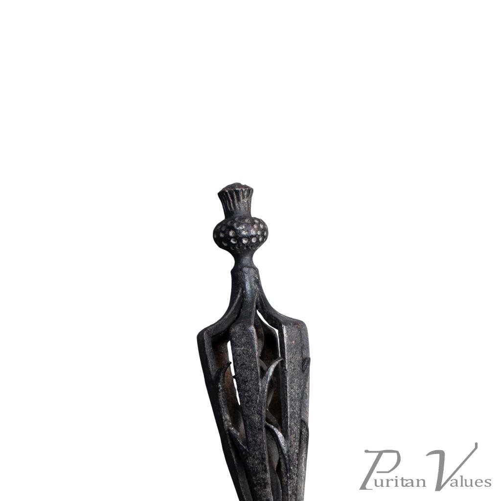 The handle terminates in a finely modelled thistle finial, beneath which an open fretwork section depicts interlacing flame-like tendrils, enclosing a central twisted rod. This structural and decorative interplay captures the Guild’s belief in the visible expression of labour within design. The main shaft, of hammered steel, is detailed with a rat-tail scroll for hanging and a twisted mid-section that transitions into the shovel head.