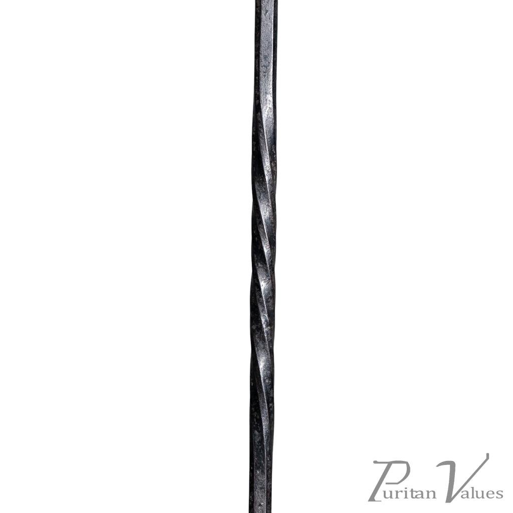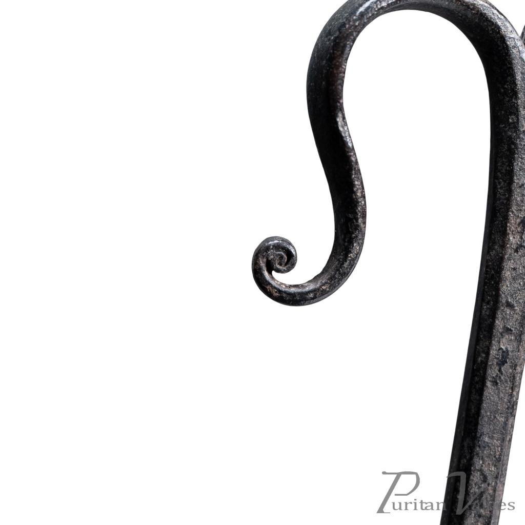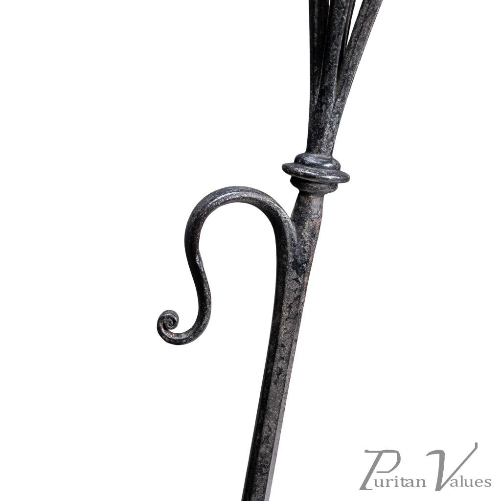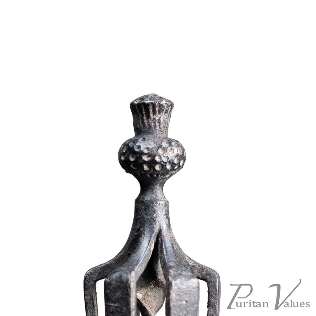 The handle terminates in a finely modelled thistle finial, beneath which an open fretwork section depicts interlacing flame-like tendrils, enclosing a central twisted rod. This structural and decorative interplay captures the Guild’s belief in the visible expression of labour within design. The main shaft, of hammered steel, is detailed with a rat-tail scroll for hanging and a twisted mid-section that transitions into the shovel head.