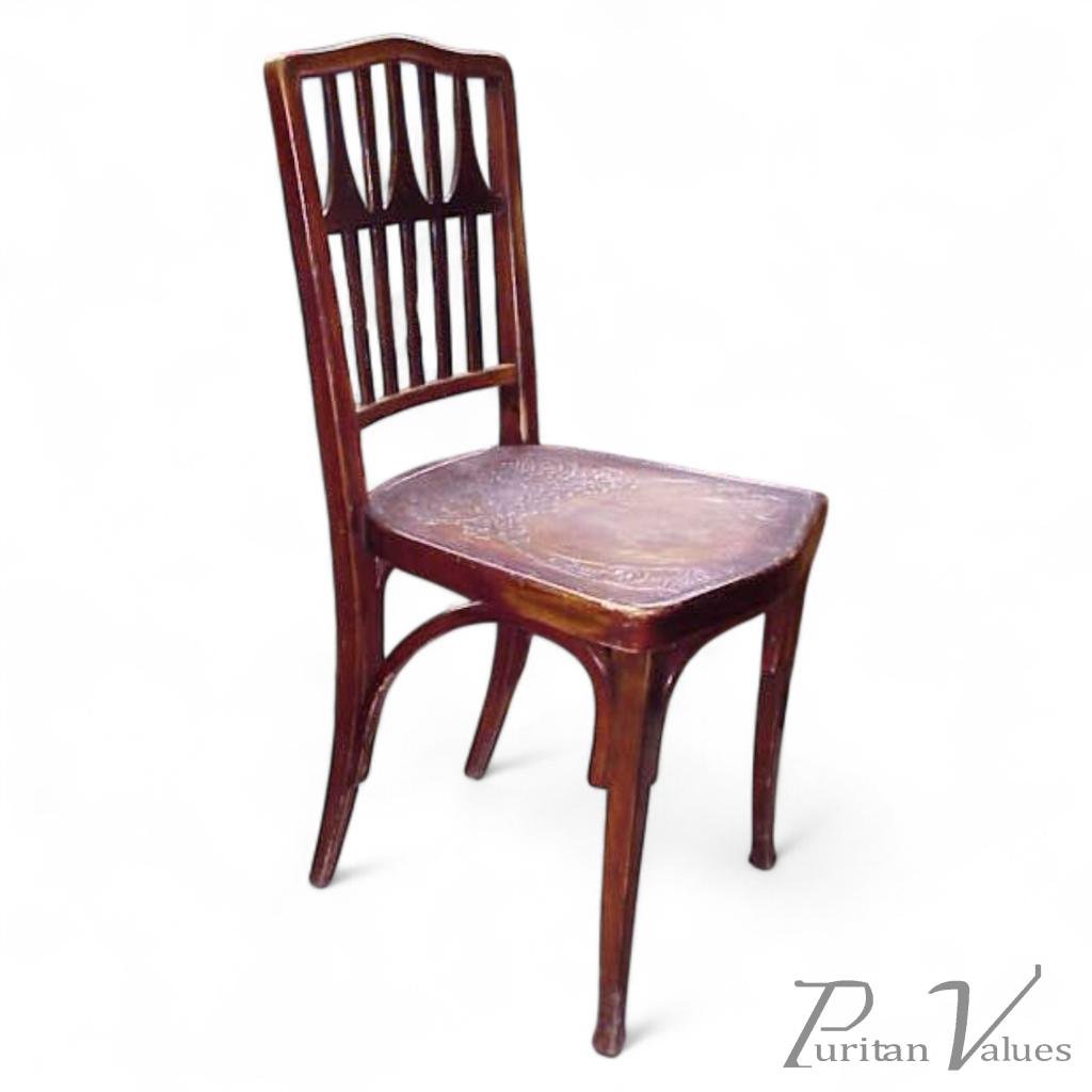 A pair of bentwood chairs designed by Gustuv Siegel with stylised floral embossed seats, made by J and J Kohn. Circa 1910.