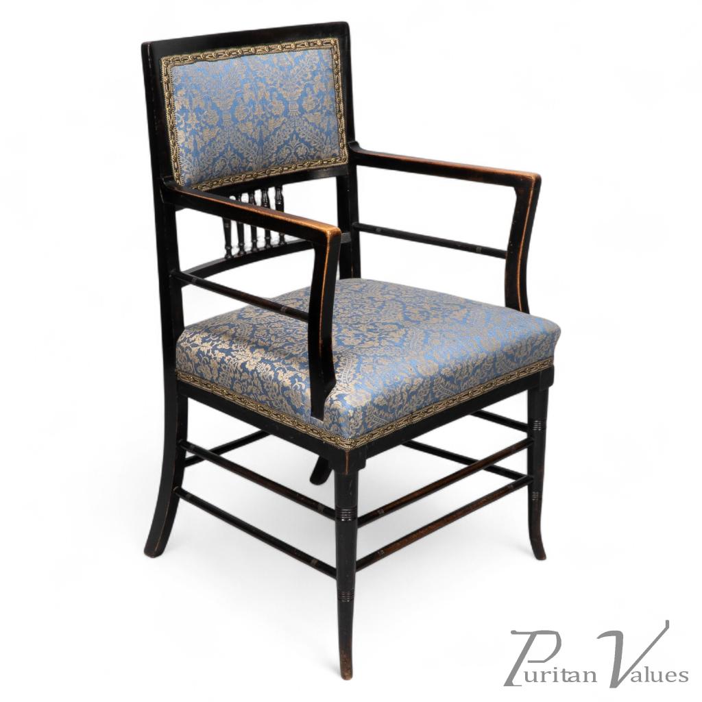 H. W. Batley or E. W. Godwin for Collinson & Lock attributed, professionally reupholstered in a gold and blue damask. The spindle turnings to the back and how the arms are joined to the backrest, including the splayed front legs and side stretchers with fine incised turned details, are both typical of Batley and Godwin for Collinson & Lock. Batley was a pupil of Bruce J. Talbert, and he designed furniture for Collinson & Lock and James Shoolbred & Co.