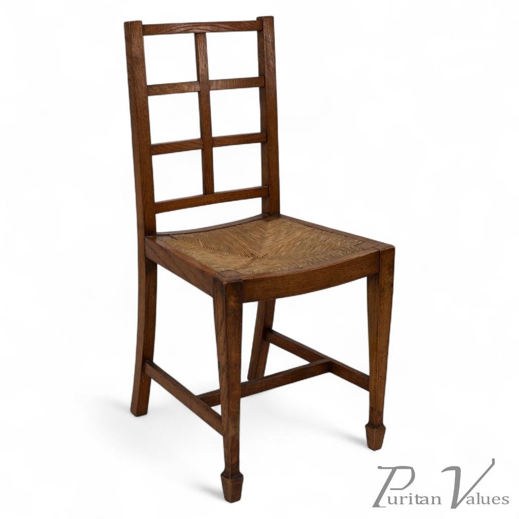 This side chair in oak sits in the later Arts & Crafts (1880–1910) tradition, c.1920, British. A rectilinear lattice of four squares rises within the back over a tight drop-in rush seat. The frame is pared to essentials, with square legs, crisp shoulders and straight stretchers giving a compact, serviceable scale for dining or writing.
