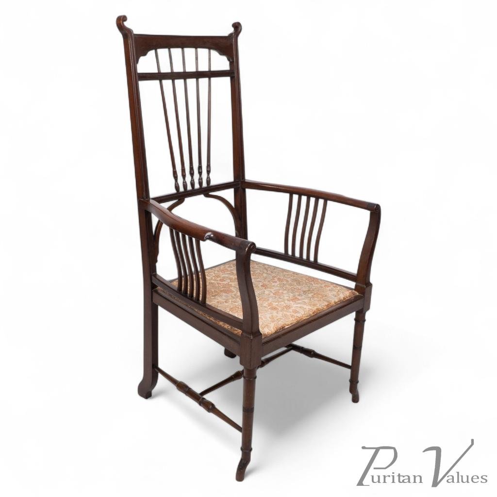 An Aesthetic Movement mahogany armchair with curled finials and a spray of elongated turned details to the back. The shaped arms have curved supports below, stood on turned legs united by a H stretcher and outswept feet.