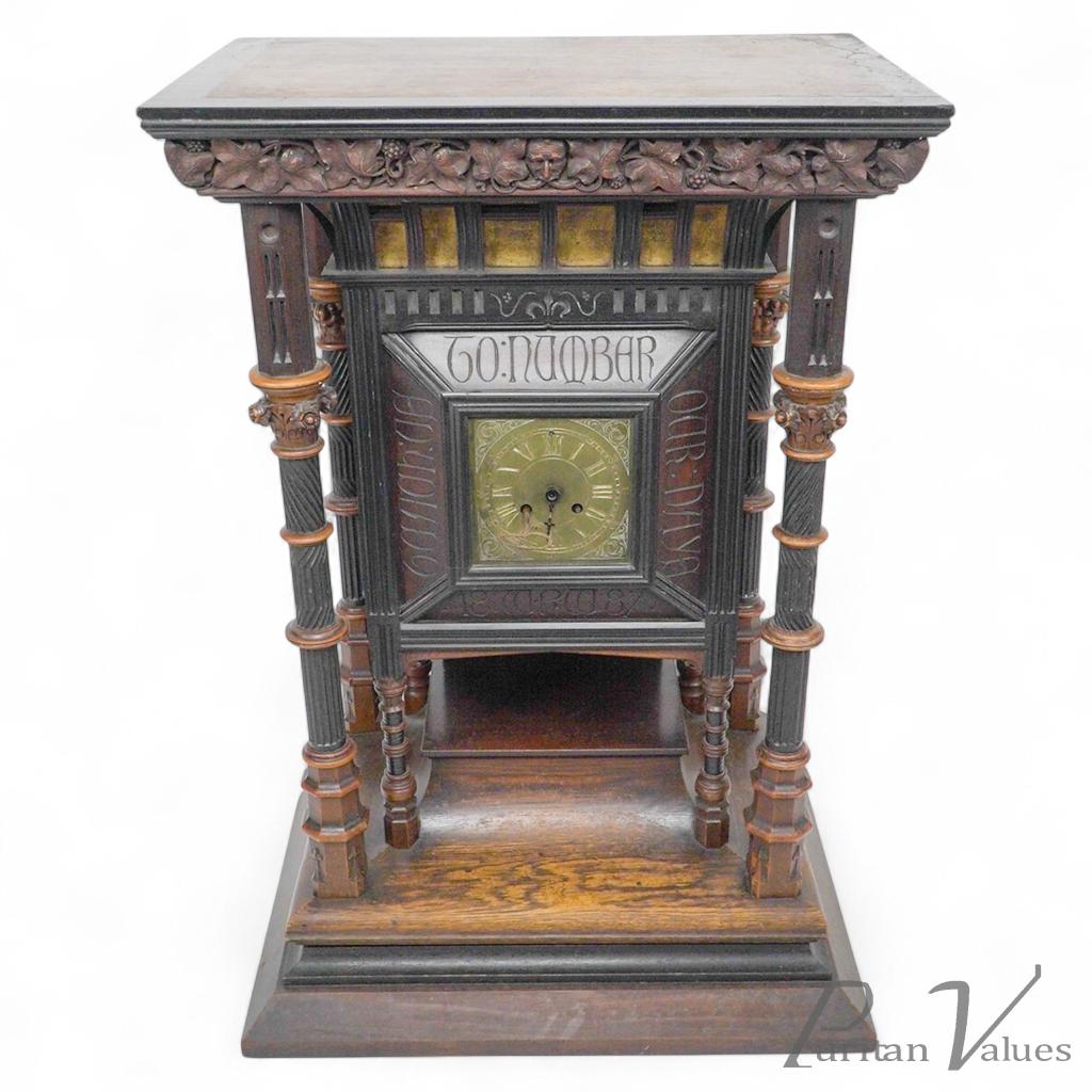 A large Aesthetic Movement exhibition quality oak and walnut bracket clock. The top edge beautifully carved with floral decoration and the Green Man to the centre. An arched lattice and gilded section below. A circular brass dial with a quote which reads: Teach Us To Number Our Days and 1877 with initials W RW.