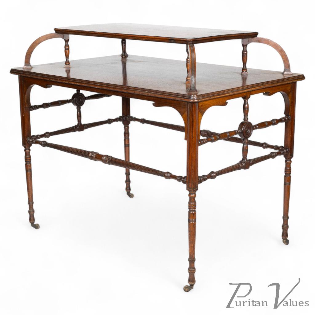 A high art Aesthetic Movement walnut centre tea table with an unusual raised upper shelf to the centre of the main top on arched and turned supports. The top with shaped and incised aprons to the corners with fine turned legs united by turned and fluted stretchers, the ends with turned cross stretchers uniting a central circular disc. Original Howard & Sons paper label underneath.