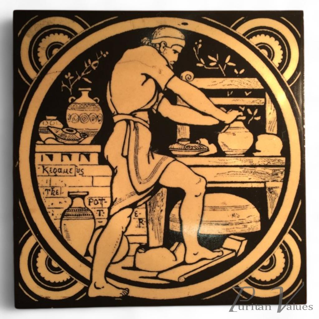 John Moyr Smith for Mintons. A set of eight printed earthenware tiles in black and white variants, each illustrating a scene from Shakespeare’s plays within a circular frame surrounded by stylised lettering and decorative borders. Designed by John Moyr Smith and produced by Mintons at their Stoke-on-Trent works, the tiles exemplify the firm’s mastery of transfer printing on earthenware. These designs merge narrative illustration with decorative purpose, reflecting the influence of literature, the Aesthetic Movement, and the ideals of the Arts and Crafts tradition in late Victorian design.