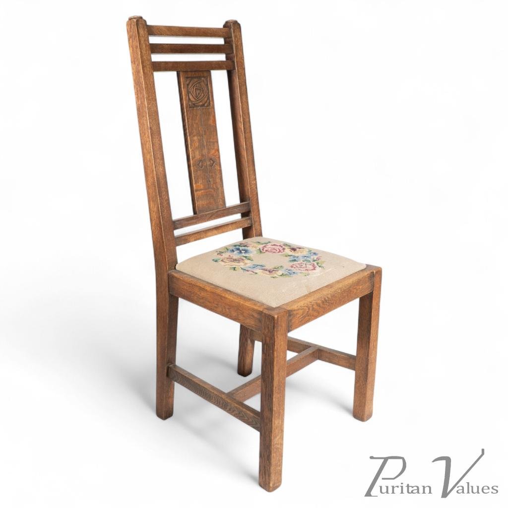 An Arts and Crafts oak chair with carved rose decoration to the back, the drop-in seat with colorful embroidery.