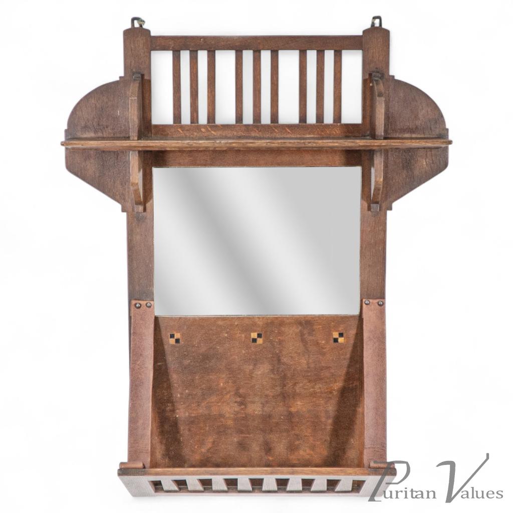An Arts & Crafts oak hanging paper rack with central mirror, with an upper shelf and ebonised and boxwood square inlays, the storage compartment with leather straps.