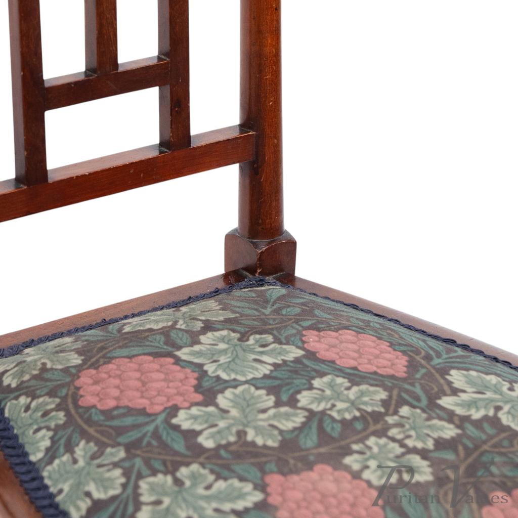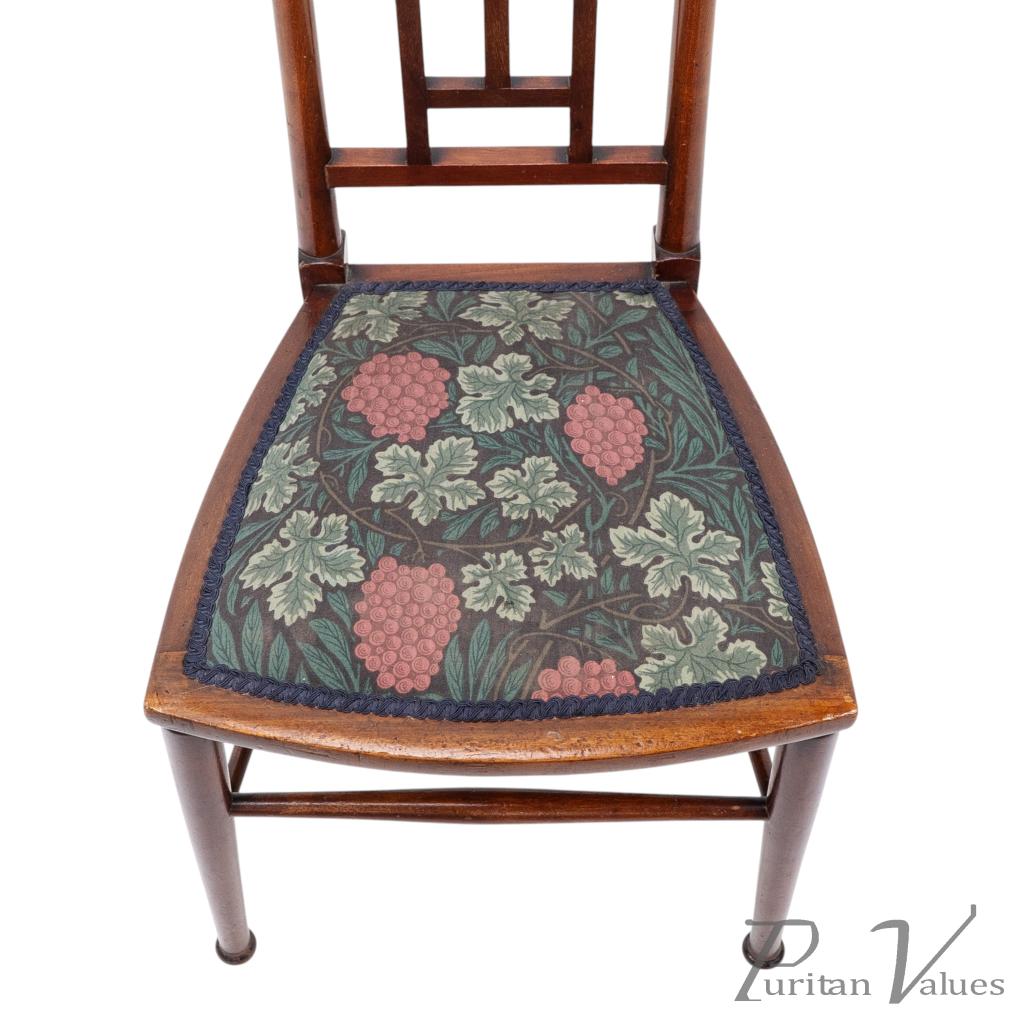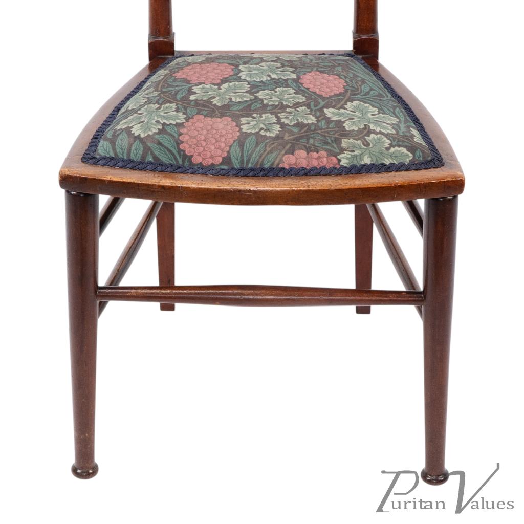 By William Birch for Liberty and Co, a walnut side chair designed by E. G. Punnett, aligned to the Arts and Crafts movement (1880–1910), c.1901. The tall rectangular back has a narrow top rail set with two circular floral medallion inlays in contrasting sycamore and boxwood, divided by square apertures, above an open three-bar panel. A trapezoidal upholstered seat with grape-and-leaf patterned textile sits on round legs with twin side stretchers and a single front and rear stretcher.